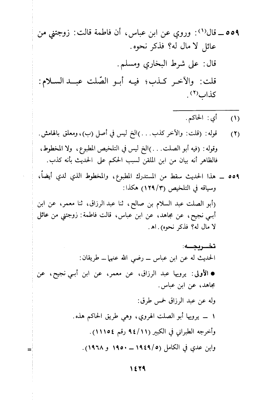 (أبو الصلت عبد السلام بن صالح، ثنا عبد الرزاق، ثنا معمر، عن ابن أبي نجيح، عن مجاهد، عن ابن عباس، قالت فاطمة: زوجتني من عائل لا مال له؟ فذكر نحوه). اهـ.