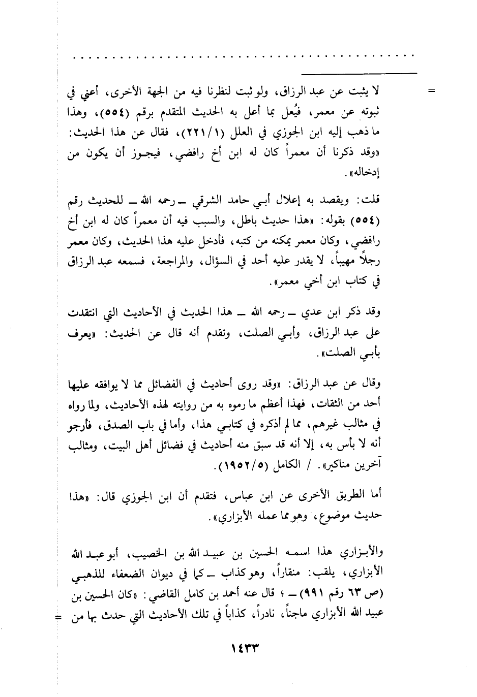 قلت: ويقصد به إعلال أبي حامد الشرقي -رحمه الله- للحديث رقم (554) بقوله: "هذا حديث باطل، والسبب فيه أن معمراً كان له ابن أخ رافضي، وكان معمر يمكنه من كتبه، فأدخل عليه هذا الحديث، وكان معمر رجلاً مهيباً، لا يقدر عليه أحد في السؤال، والمراجعة، فسمعه عبد الرزاق في كتاب ابن أخي معمر".