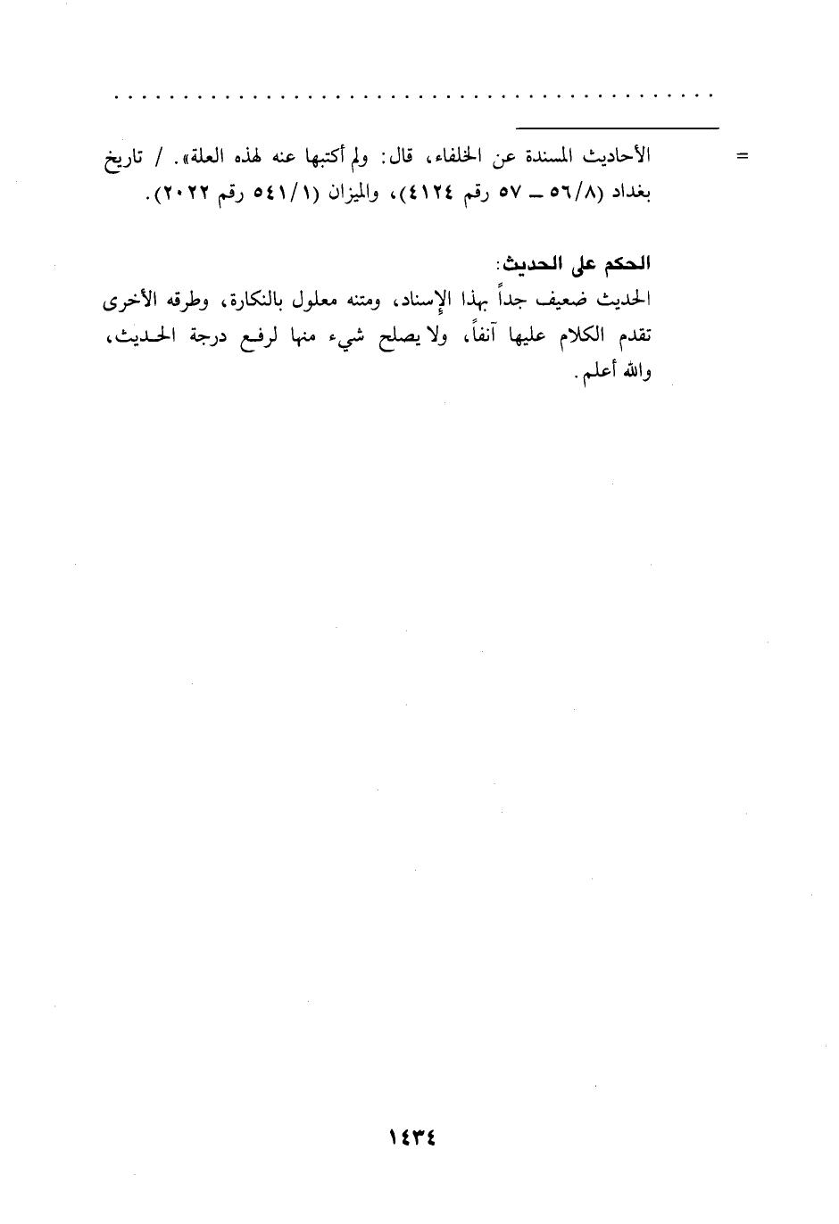 = الأحاديث المسندة عن الخلفاء، قال: ولم أكتبها عنه لهذه العلة"./ تاريخ بغداد (8/ 56 - 57 رقم 4124)، والميزان (1/ 541 رقم 2022).