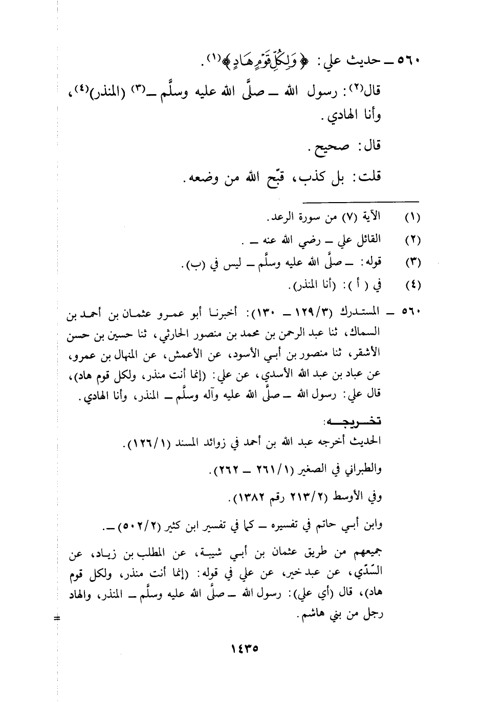 560 - المستدرك (3/ 129 - 130): أخبرنا أبو عمرو عثمان بن أحمد بن السماك، ثنا عبد الرحمن بن محمد بن منصور الحارثي، ثنا حسين بن حسن الأشقر، ثنا منصور بن أبي الأسود، عن الأعمش، عن المنهال بن عمرو، عن عباد بن عبد الله الأسدي، عن علي: (إنما أنت منذر، ولكل قوم هاد)، قال علي: رسول الله -صلى الله عليه وآله وسلم- المنذر، وأنا الهادي.