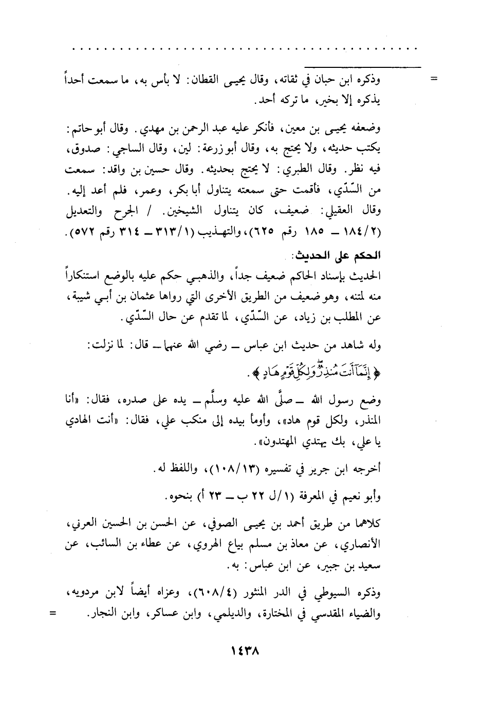 وقال العقيلي: ضعيف، كان يتناول الشيخين./ الجرح والتعديل (2/ 184 - 185 رقم 625)، والتهذيب (1/ 313 - 314 رقم 572).
