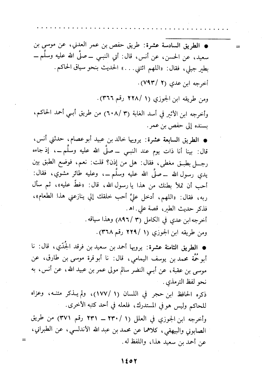 * الطريق السادسة عشرة: طريق حفص بن عمر العدني، عن موسى بن سعيد، عن الحسن، عن أنس، قال: أتي النبي -صلى الله عليه وسلم- بطير جبلي، فقال: "اللهم ائتني ... " الحديث بنحو سياق الحاكم.