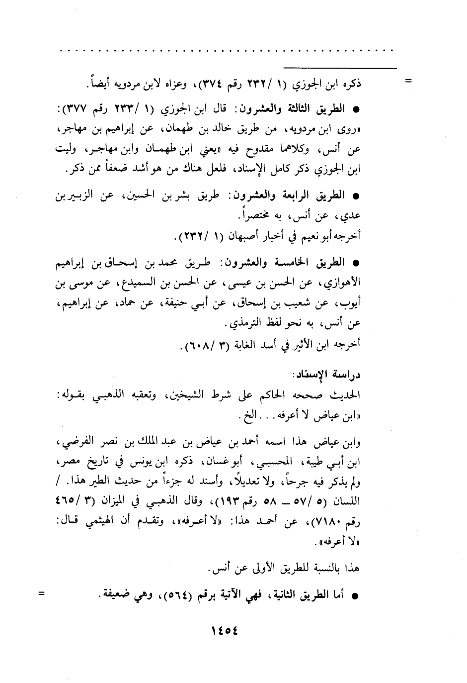 * الطريق الثالثة والعشرون: قال ابن الجوزي (1/ 233رقم 377): "روى ابن مردويه، من طريق خالد بن طهمان، عن إبراهيم بن مهاجر، عن أنس، وكلاهما مقدوح فيه "يعني ابن طهمان وابن مهاجر، وليت ابن الجوزي ذكر كامل الِإسناد، فلعل هناك من هو أشد ضعفاً ممن ذكر.