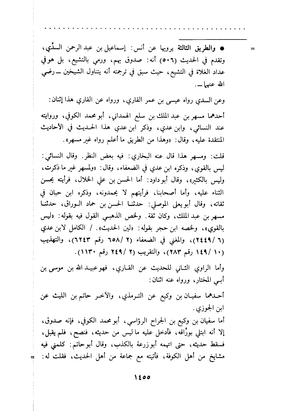 قلت: ومسهر هذا قال عنه البخاري: فيه بعض النظر. وقال النسائي: ليس بالقوي، وذكره ابن عدي في الضعفاء، وقال: "ولمسهر غير ما ذكرت، وليس بالكثير"، وقال أبو داود: أما الحسن بن علي الخلال، فرأيته يحسن الثناء عليه، وأما أصحابنا، فرأيتهم لا يحمدونه، وذكره ابن حبان في ثقاته، وقال أبو يعلى الموصلي: حدثنا الحسن بن حماد الوراق، حدثنا مسهر بن عبد الملك، وكان ثقة. ولخص الذهبي القول فيه بقوله: "ليس بالقوي"، ولخصه ابن حجر بقوله: "لين الحديث"./ الكامل لابن عدي (6/ 2449)، والمغني في الضعفاء (2/ 658رقم 6243)، والتهذيب (10/ 149رقم 283)، والتقريب (2/ 249 رقم1130).