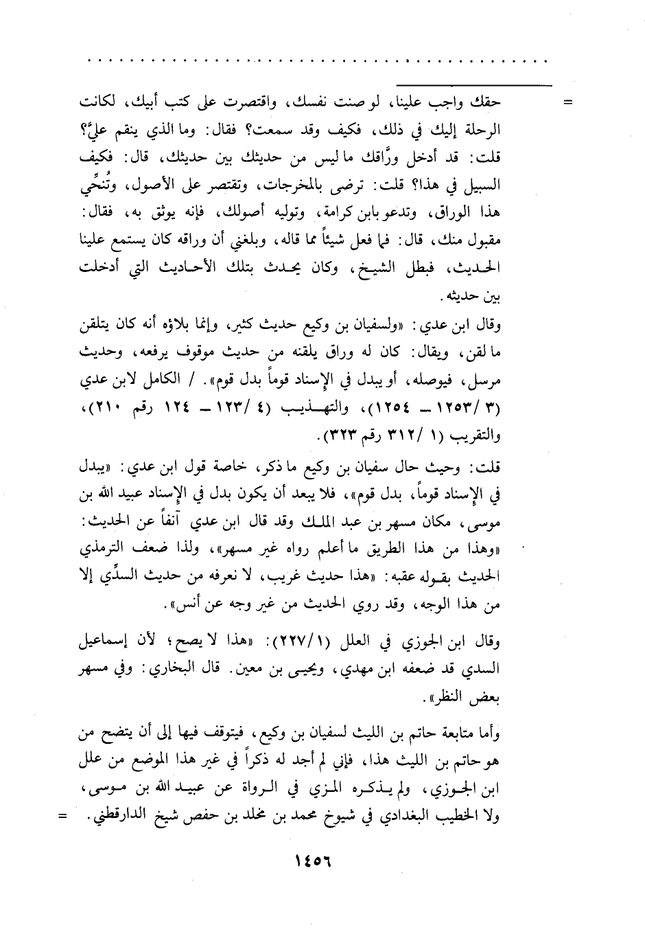 وأما متابعة حاتم بن الليث لسفيان بن وكيع، فيتوقف فيها إلى أن يتضح من هو حاتم بن الليث هذا، فإني لم أجد له ذكراً في غير هذا الموضع من علل ابن الجوزي، ولم يذكره المزي في الرواة عن عبيد الله بن موسى، ولا الخطيب البغدادي في شيوخ محمد بن مخلد بن حفص شيخ الدارقطني. =