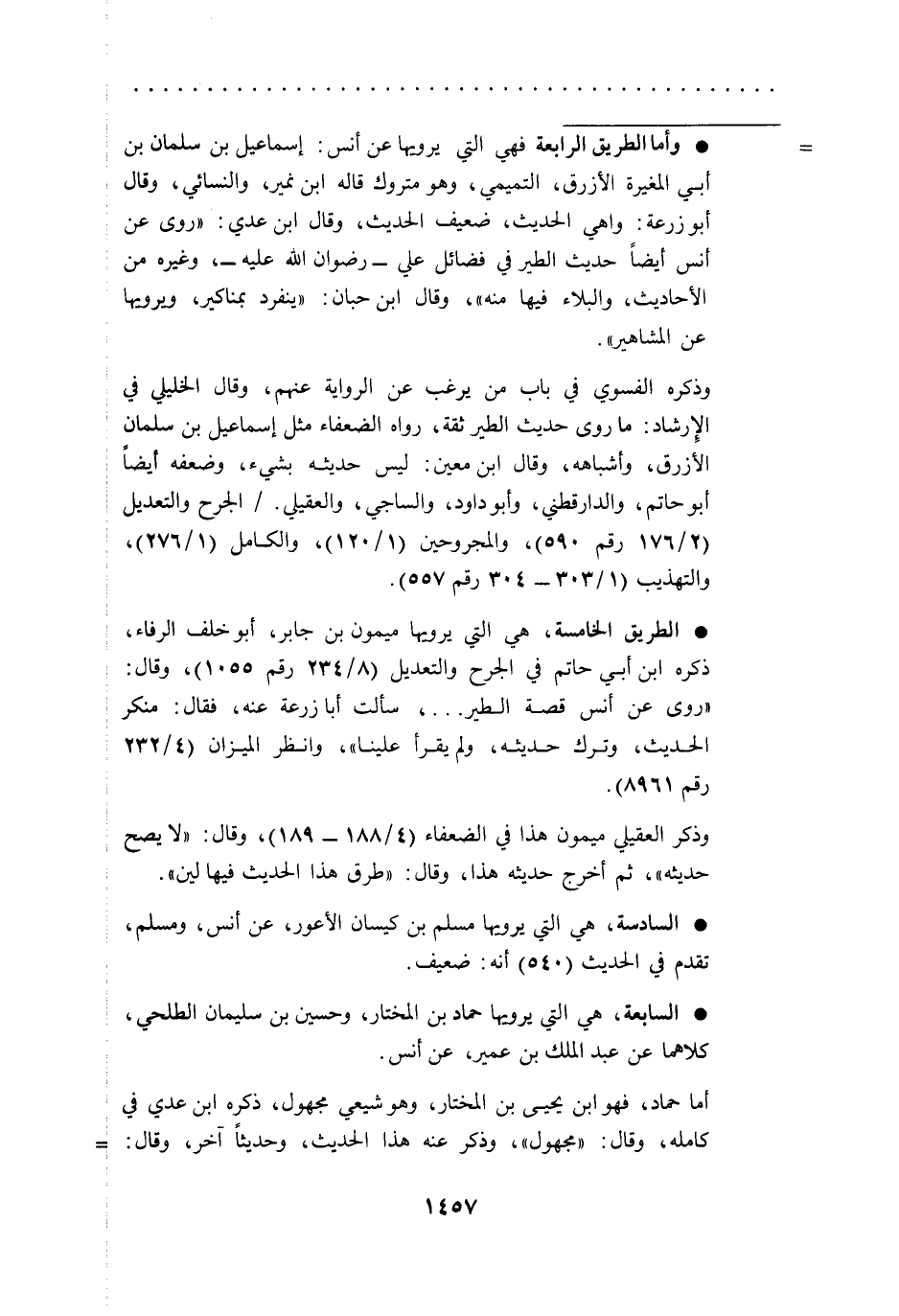 = * وأما الطريق الرابعة فهي التي يرويها عن أنس: إسماعيل بن سلمان بن أبي المغيرة الأزرق، التميمي، وهو متروك قاله ابن نمير، والنسائي، وقال أبو زرعة: واهي الحديث، ضعيف الحديث، وقال ابن عدي: "روى عن أنس أيضاً حديث الطير في فضائل علي -رضوان الله عليه-، وغيره من الأحاديث، والبلاء فيها منه"، وقال ابن حبان: "ينفرد بمناكير، ويرويها عن المشاهير".