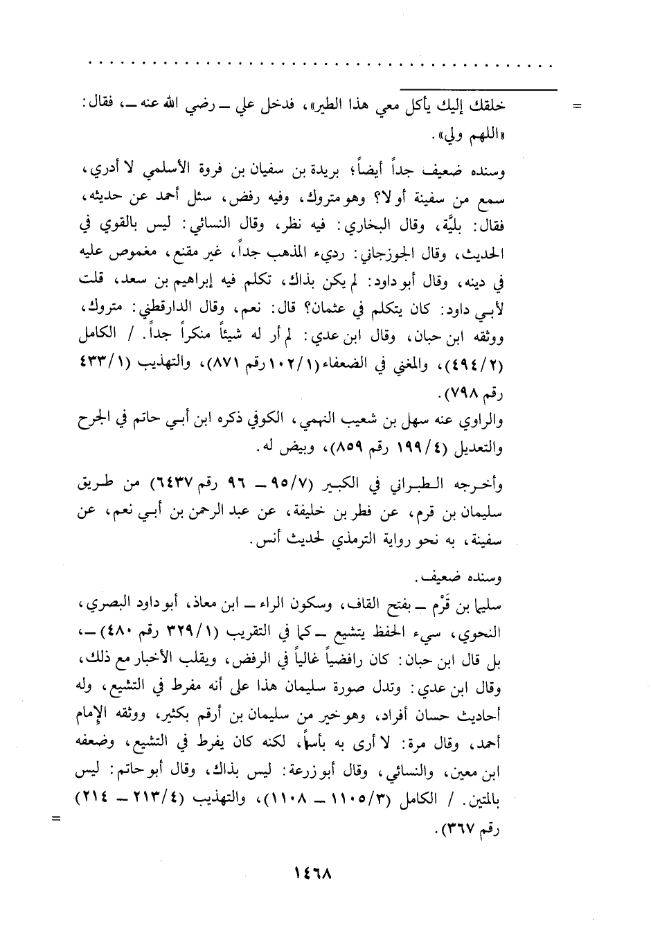 سليما بن قَرْم -بفتح القاف، وسكون الراء- ابن معاذ، أبو داود البصري، النحوي، سيء الحفظ يتشيع -كما في التقريب (1/ 329رقم 480) -، بل قال ابن حبان: كان رافضياً غالياً في الرفض، ويقلب الأخبار مع ذلك، وقال ابن عدي: وتدل صورة سليمان هذا على أنه مفرط في التشيع، وله أحاديث حسان أفراد، وهو خير من سليمان بن أرقم بكثير، ووثقه الِإمام أحمد، وقال مرة: لا أرى به بأساً، لكنه كان يفرط في التشيع، وضعفه ابن معين، والنسائي، وقال أبو زرعة: ليس بذاك، وقال أبو حاتم: ليس بالمتين./ الكامل (3/ 1105 - 1108)، والتهذيب (4/ 213 - 214) رقم 367). =