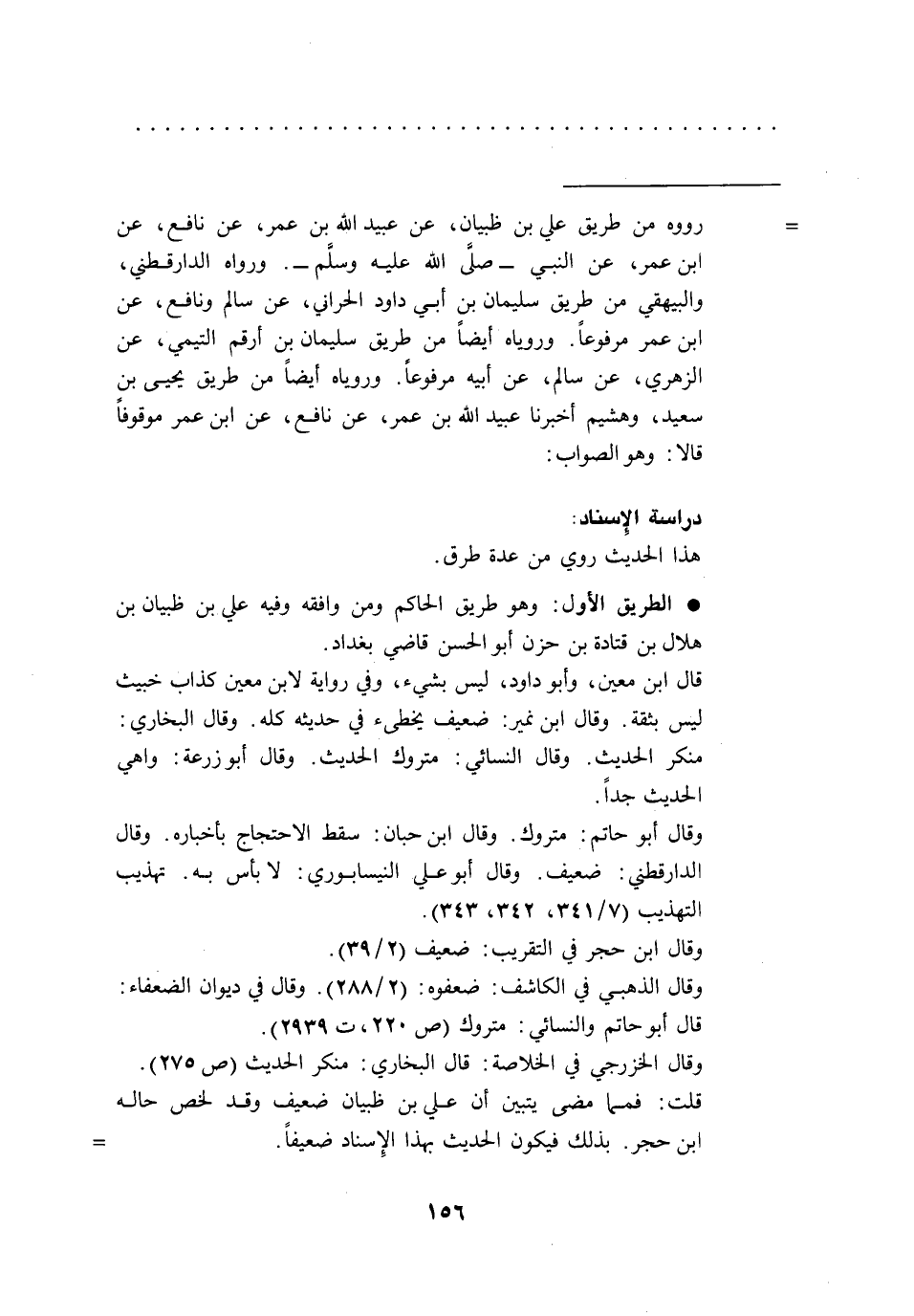 = رووه من طريق علي بن ظبيان، عن عبيد الله بن عمر، عن نافع، عن ابن عمر، عن النبي -صلى الله عليه وسلم-. ورواه الدارقطني، والبيهقي من طريق سليمان بن أبي داود الحراني، عن سالم ونافع، عن ابن عمر مرفوعاً. وروياه أيضاً من طريق سليمان بن أرقم التيمي، عن الزهري، عن سالم، عن أبيه مرفوعاً. وروياه أيضاً من طريق يحيى بن سعيد، وهشيم أخبرنا عبيد الله بن عمر، عن نافع، عن ابن عمر موقوفاً قالا: وهو الصواب: