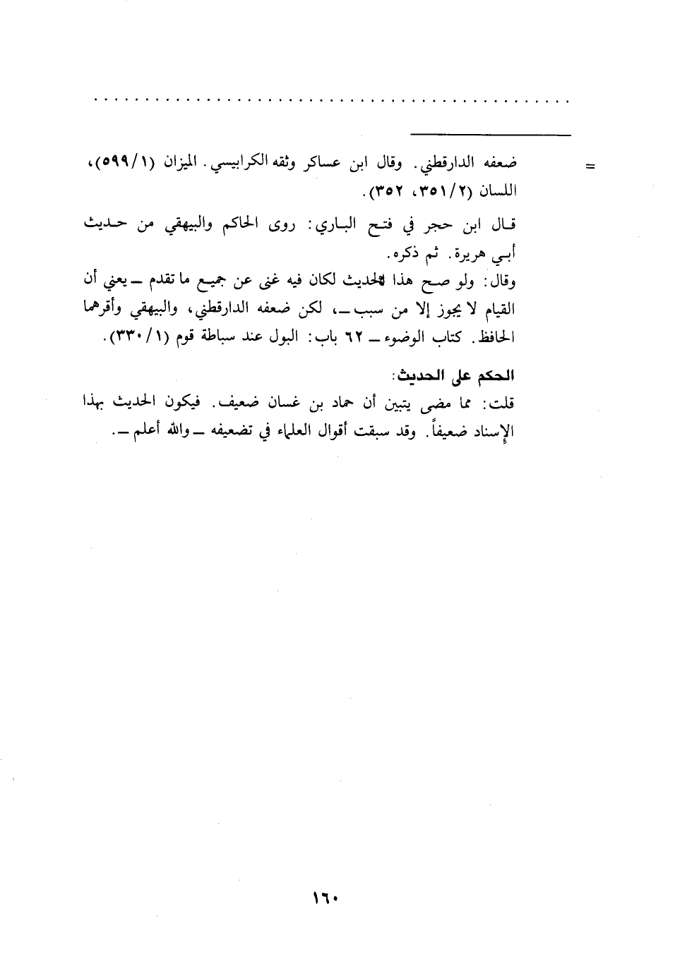 وقال: ولو صح هذا الحديث لكان فيه غنى عن جميع ما تقدم -يعني أن القيام لا يجوز إلا من سبب-، لكن ضعفه الدارقطني، والبيهقي وأقرهما الحافظ. كتاب الوضوء- 62 باب: البول عند سباطة قوم (1/ 330).