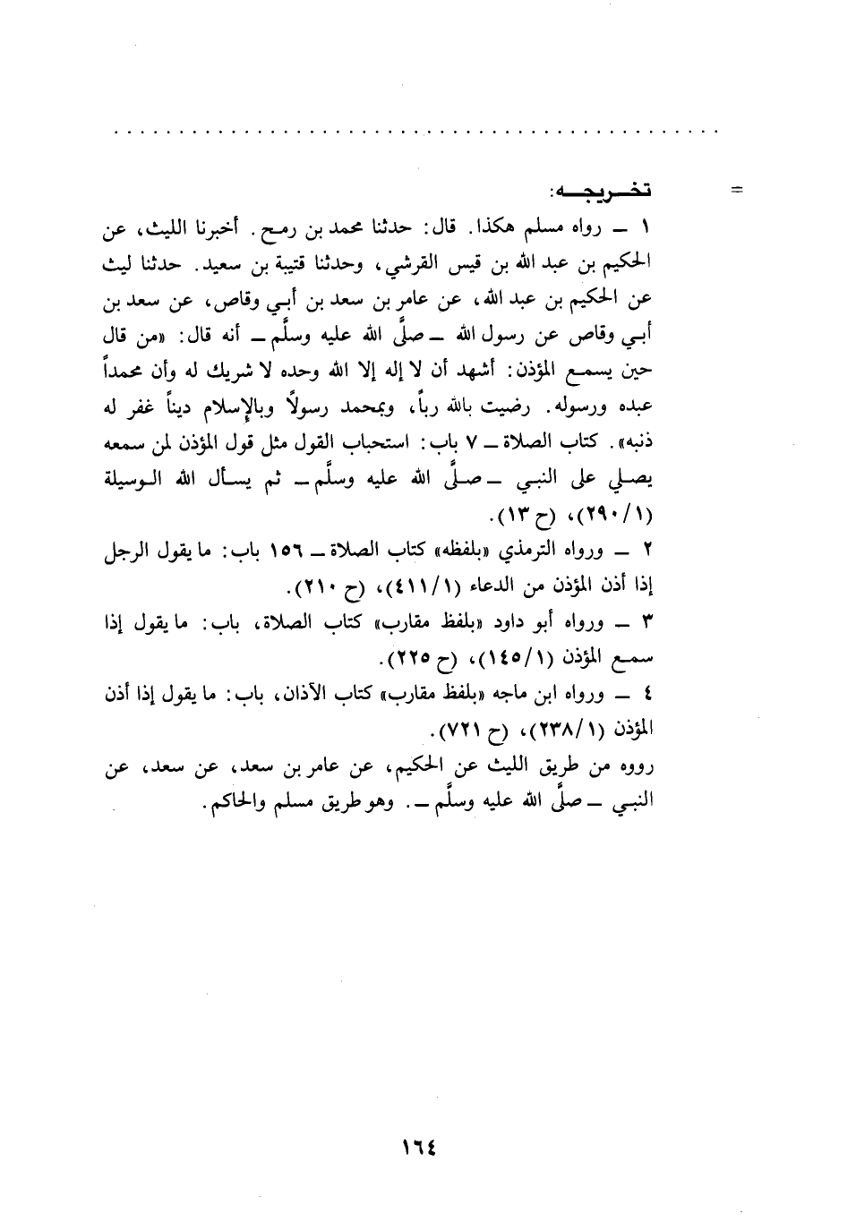 1 - رواه مسلم هكذا. قال: حدثنا محمد بن رمح. أخبرنا الليث، عن الحكيم بن عبد الله بن قيس القرشي، وحدثنا قتيبة بن سعيد. حدثنا ليث عن الحكيم بن عبد الله، عن عامر بن سعد بن أبي وقاص، عن سعد بن أبي وقاص عن رسول الله -صلى الله عليه وسلم- أنه قال: "من قال حين يسمع المؤذن: أشهد أن لا إله إلا الله وحده لا شريك له وأن محمداً عبده ورسوله. رضيت بالله ربا، وبمحمد رسولاً وبالإسلام ديناً غفر له ذنبه". كتاب الصلاة- 7 باب: استحباب القول مثل قول المؤذن لمن سمعه يصلي على النبي -صلى الله عليه وسلم- ثم يسأل الله الوسيلة (1/ 290)، (ح 13).