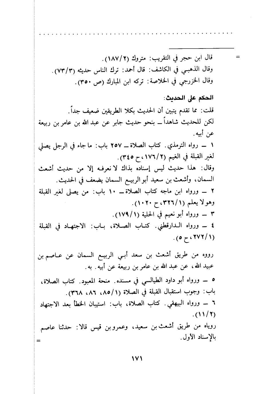 رووه من طريق أشعث بن سعد أبي الربيع السمان عن عاصم بن عبيد الله، عن عبد الله بن عامر بن ربيعة عن أبيه. به.