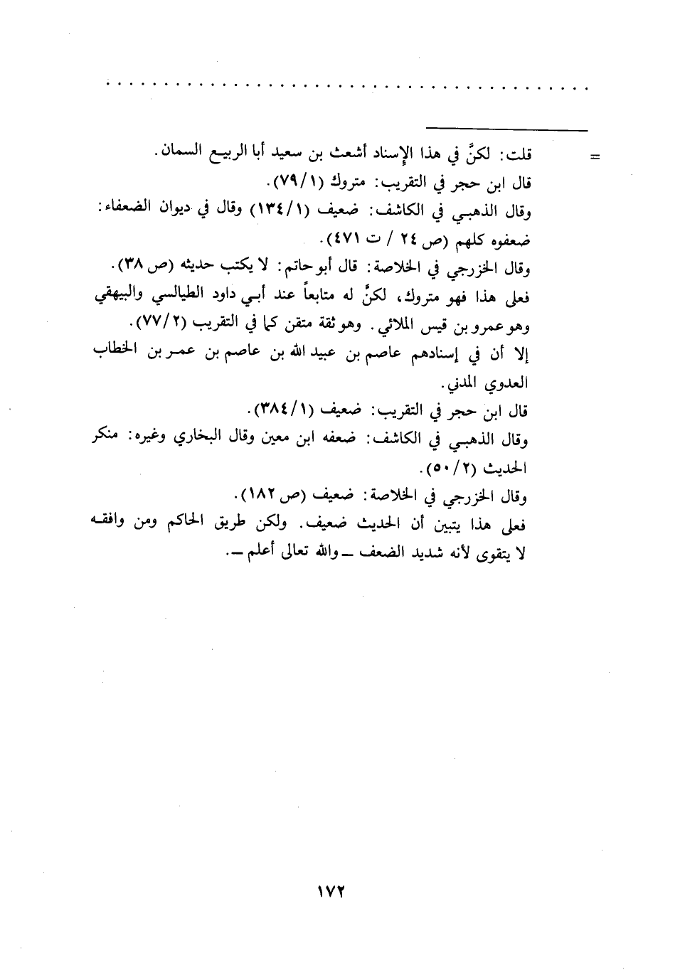 فعلى هذا فهو متروك، لكنَّ له متابعاً عند أبي داود الطيالسي والبيهقي وهو عمرو بن قيس الملائي. وهو ثقة متقن كما في التقريب (2/ 77).