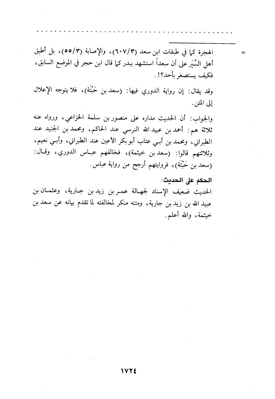 والجواب: أن الحديث مداره على منصور بن سلمة الخزاعي، ورواه عنه ثلاثة هم: أحمد بن عبيد الله النرسي عند الحاكم، ومحمد بن الجنيد عند الطبراني، ومحمد بن أبي عتاب أبو بكر الأعين عند الطبراني، وأبي نعيم، وثلاثتهم قالوا: (سعد بن خيثمة)، فخالفهم عباس الدوري، وقال: (سعد بن حَبْتَة)، فروايتهم أرجح من رواية عباس.