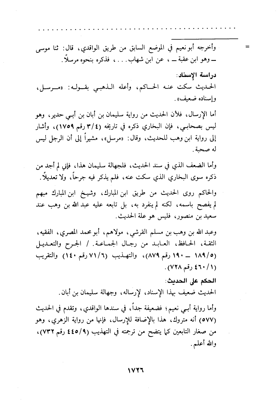 وأما رواية أبي نعيم؛ فضعيفة جداً، في سندها الواقدي، وتقدم في الحديث (577) أنه متروك، هذا بالِإضافة للإرسال، فإنها من رواية الزهري، وهو من صغار التابعين كما يتضح من ترجمته في التهذيب (9/ 445رقم 732)، والله أعلم.