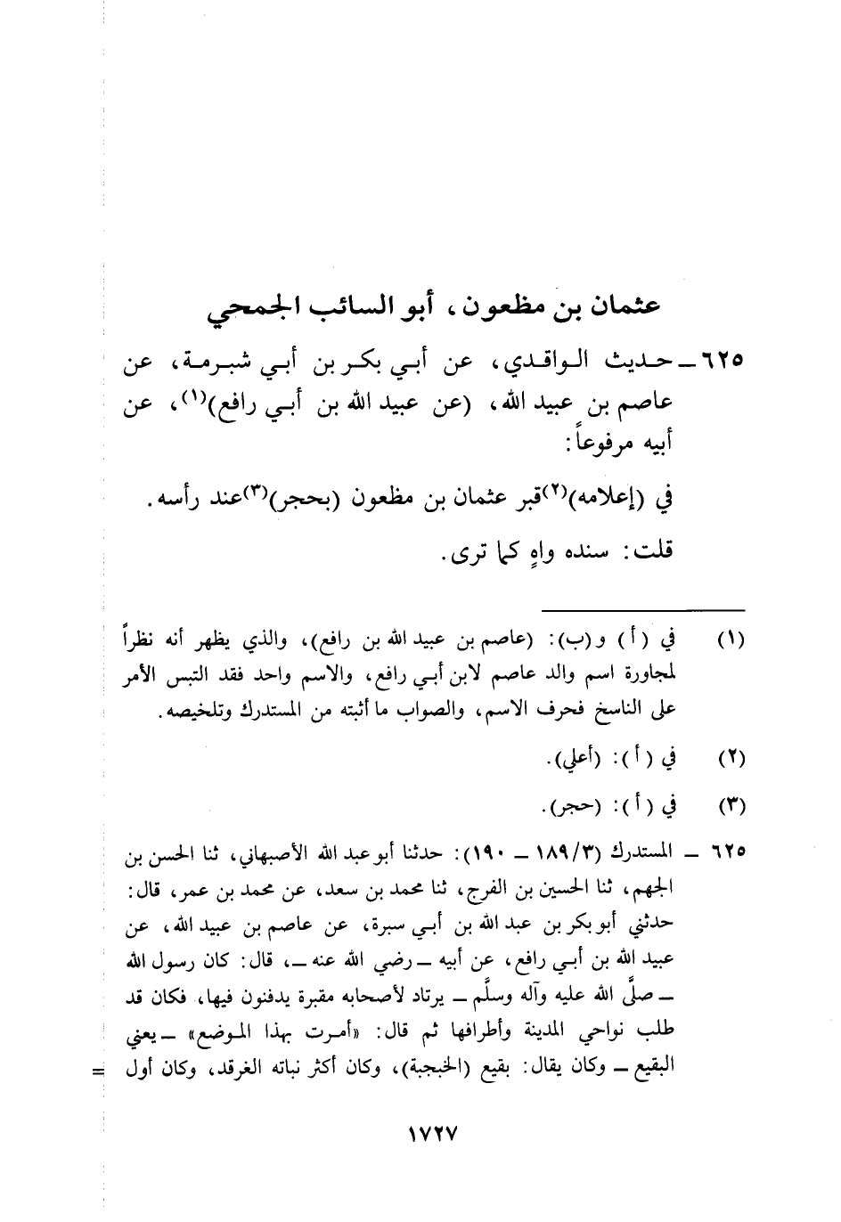 625 - المستدرك (3/ 189 - 190): حدثنا أبو عبد الله الأصبهاني، ثنا الحسن بن الجهم، ثنا الحسين بن الفرج، ثنا محمد بن سعد، عن محمد بن عمر، قال: حدثني أبو بكر بن عبد الله بن أبي سبرة، عن عاصم بن عبيد الله، عن عبيد الله بن أبي رافع، عن أبيه -رضي الله عنه-، قال: كان رسول الله -صلى الله عليه وآله وسلم- يرتاد لأصحابه مقبرة يدفنون فيها، فكان قد طلب نواحي المدينة وأطرافها ثم قال: "أمرت بهذا الموضع" -يعني البقيع- وكان يقال: بقيع (الخبجبة)، وكان أكثر نباته الغرقد، وكان أول =