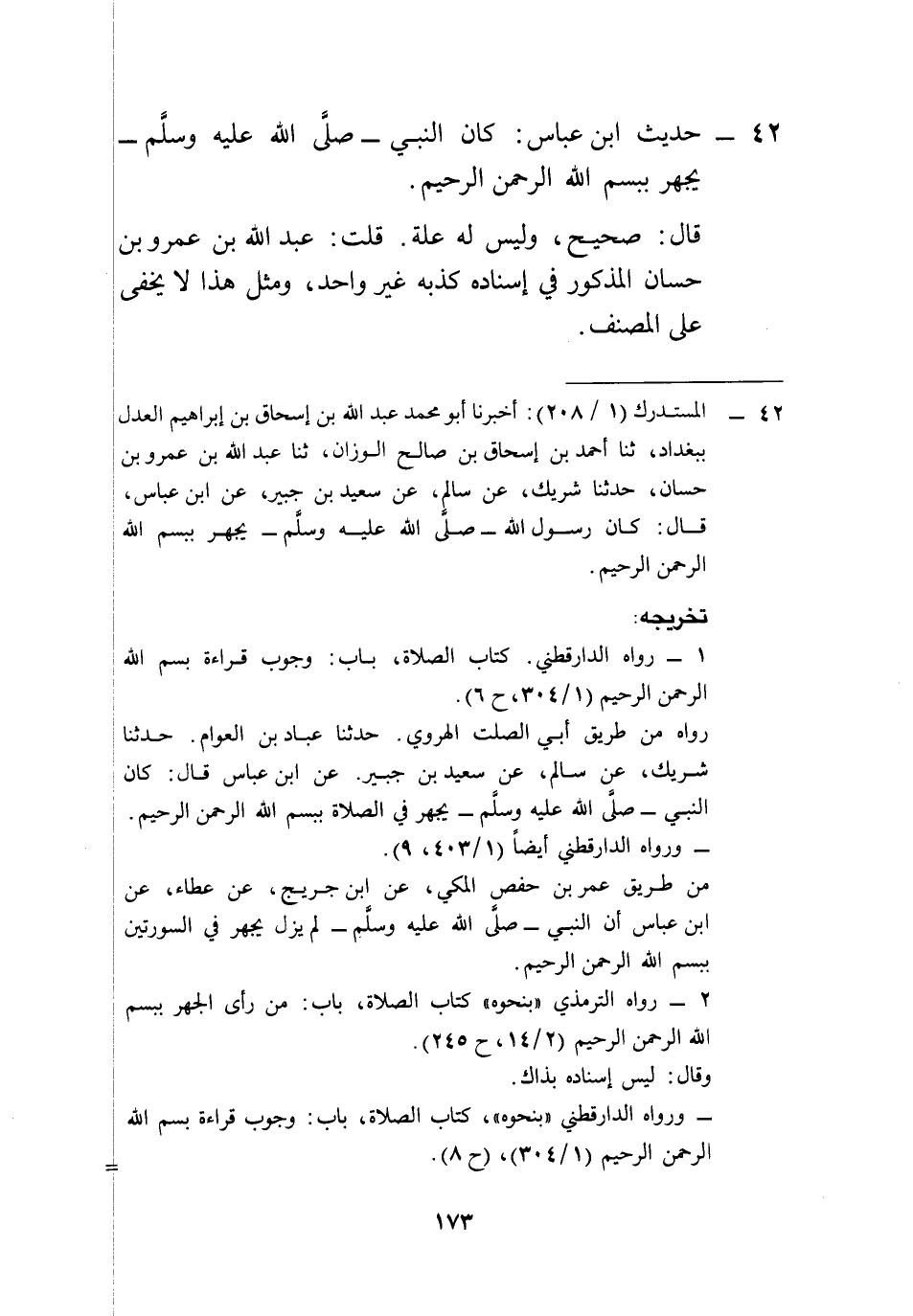 42 - المستدرك (1/ 208): أخبرنا أبو محمد عبد الله بن إسحاق بن إبراهيم العدل ببغداد، ثنا أحمد بن إسحاق بن صالح الوزان، ثنا عبد الله بن عمرو بن حسان، حدثنا شريك، عن سالم، عن سعيد بن جبير، عن ابن عباس، قال: كان رسول الله -صلى الله عليه وسلم- يجهر ببسم الله الرحمن الرحيم.