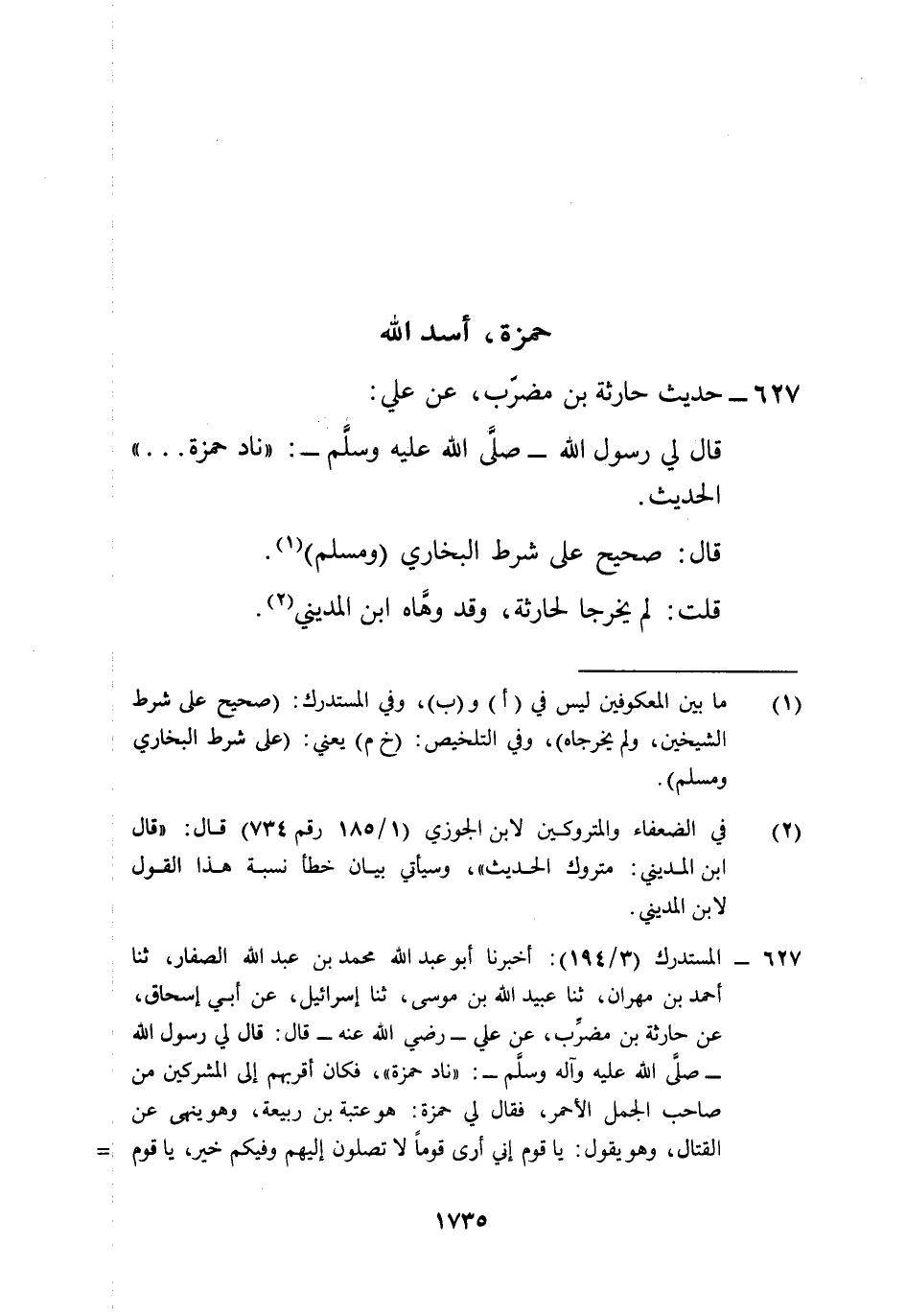 627 - المستدرك (3/ 194): أخبرنا أبو عبد الله محمد بن عبد الله الصفار، ثنا أحمد بن مهران، ثنا عبيد الله بن موسى، ثنا إسرائيل، عن أبي إسحاق، عن حارثة بن مضرِّب، عن علي -رضي الله عنه- قال: قال لي رسول الله -صلى الله عليه وآله وسلم-: "ناد حمزة"، فكان أقربهم إلى المشركين من صاحب الجمل الأحمر، فقال لي حمزة: هو عتبة بن ربيعة، وهو ينهى عن القتال، وهو يقول: يا قوم إني أرى قوماً لا تصلون إليهم وفيكم خير، يا قوم =