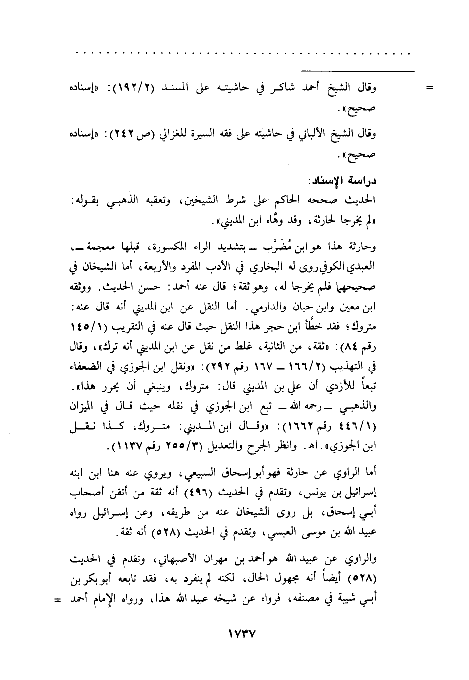أما الراوي عن حارثة فهو أبو إسحاق السبيعي، ويروي عنه هنا ابن ابنه إسرائيل بن يونس، وتقدم في الحديث (496) أنه ثقة من أتقن أصحاب أبي إسحاق، بل روى الشيخان عنه من طريقه، وعن إسرائيل رواه عبيد الله بن موسى العبسي، وتقدم في الحديث (528) أنه ثقة.