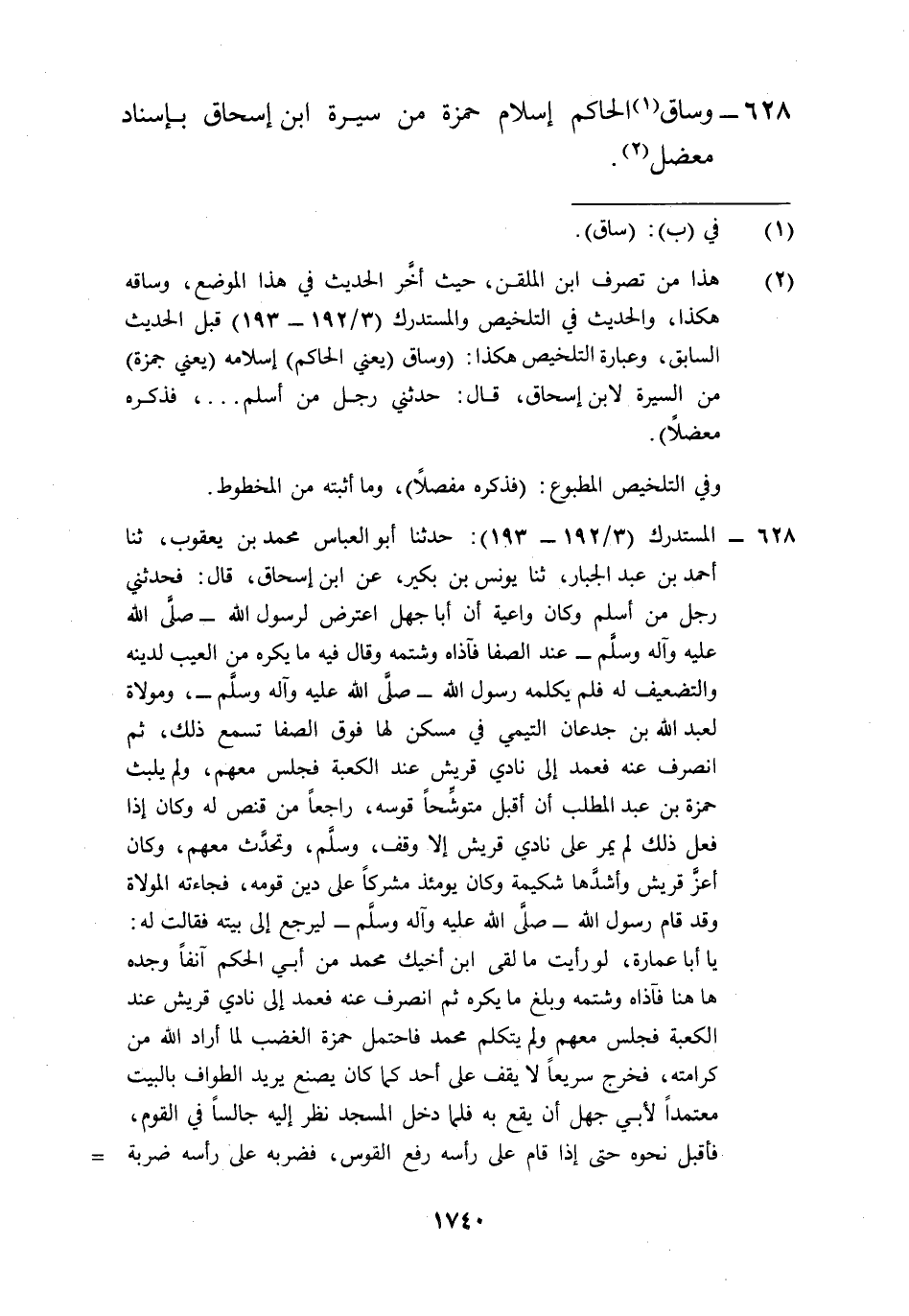 628 - وساق (¬1) الحاكم إسلام حمزة من سيرة ابن إسحاق بإسناد معضل (¬2).