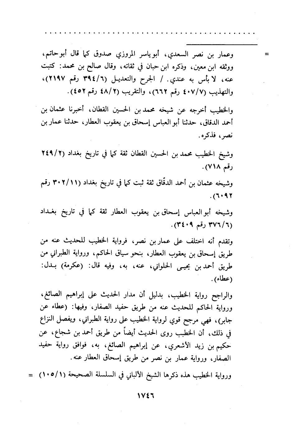 والراجح رواية الخطيب، بدليل أن مدار الحديث على إبراهيم الصائغ، ورواية الحاكم للحديث عنه من طريق حفيد الصفار، وفيها: (عطاء عن جابر)، فهي مرجح قوي لرواية الخطيب على رواية الطبراني، ويفصل النزاع في ذلك، أن الخطيب روى الحديث أيضاً من طريق أحمد بن شجاع، عن حكيم بن زيد الأشعري، عن إبراهيم الصائغ، به، فوافق رواية حفيد الصفار، ورواية عمار بن نصر من طريق إسحاق العطار عنه.