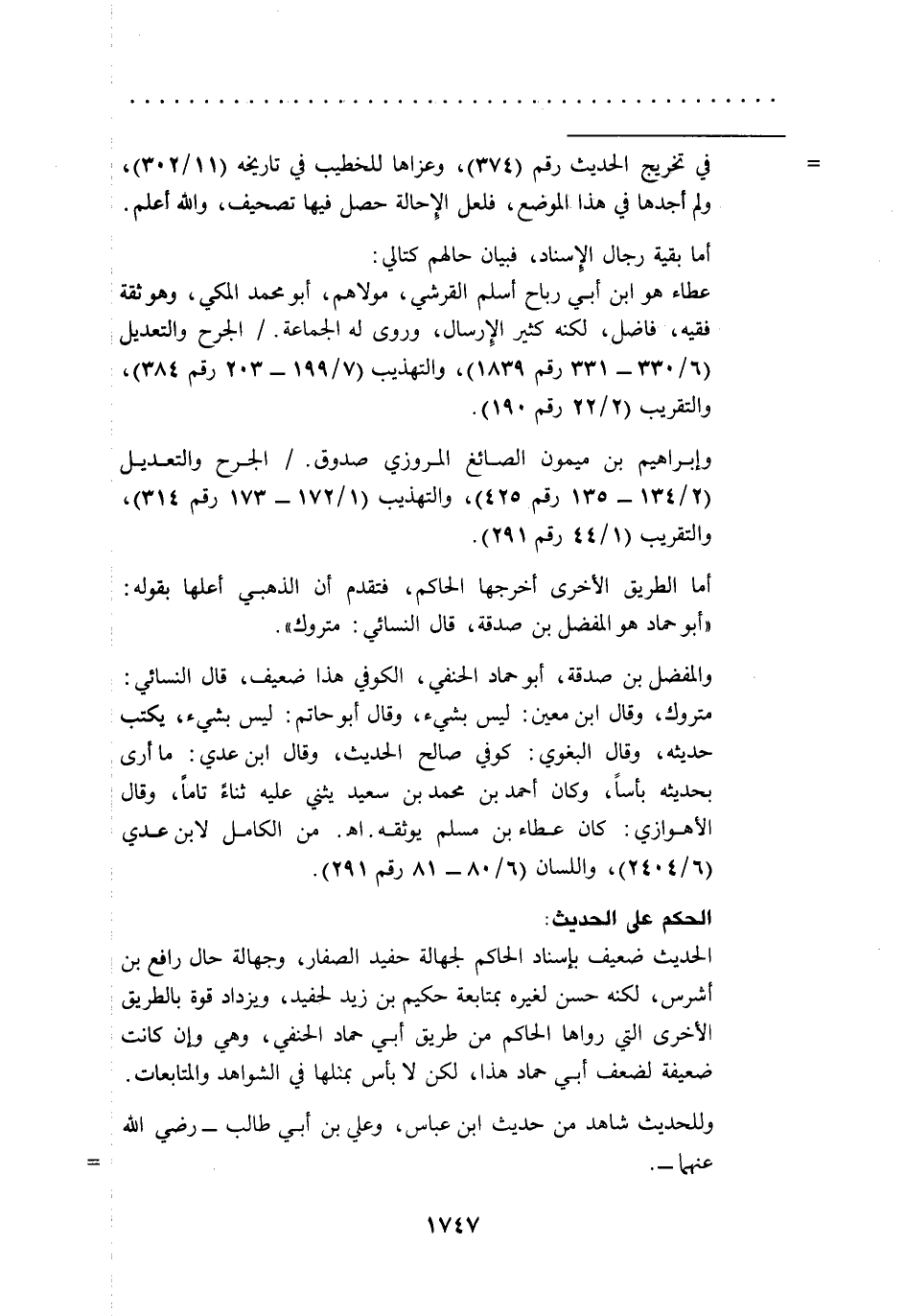 أما الطريق الأخرى أخرجها الحاكم، فتقدم أن الذهبي أعلها بقوله: "أبو حماد هو المفضل بن صدقة، قال النسائي: متروك".