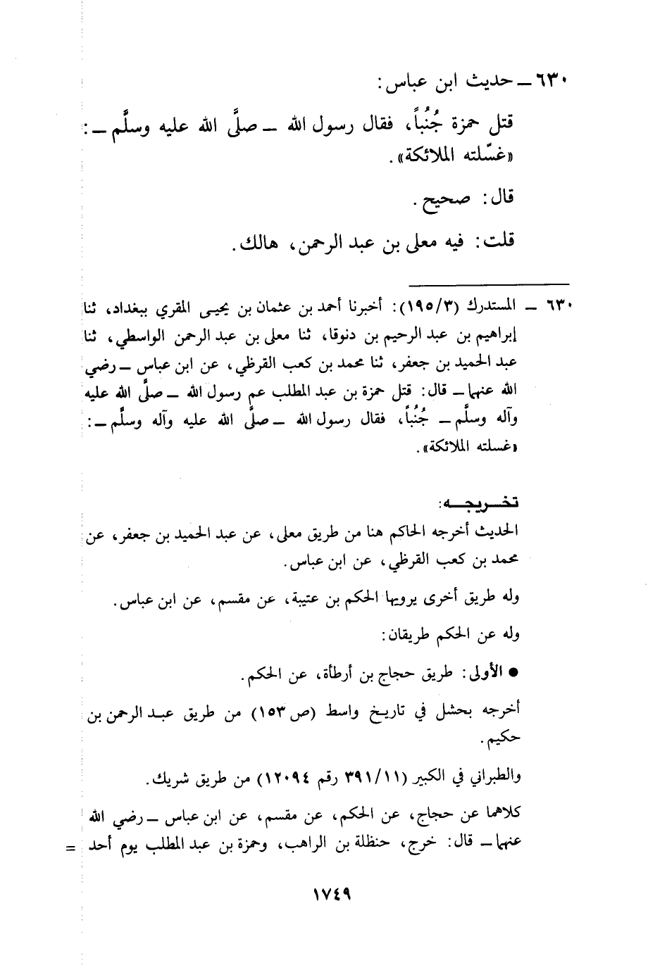 630 - المستدرك (3/ 195): أخبرنا أحمد بن عثمان بن يحيى المقري ببغداد، ثنا إبراهيم بن عبد الرحيم بن دنوقا، ثنا معلى بن عبد الرحمن الواسطي، ثنا عبد الحميد بن جعفر، ثنا محمد بن كعب القرظي، عن ابن عباس -رضي الله عنهما- قال: قتل حمزة بن عبد المطلب عم رسول الله -صلى الله عليه وآله وسلم- جُنُباً، فقال رسول الله -صلى الله عليه وآله وسلم-: "غسلته الملائكة".