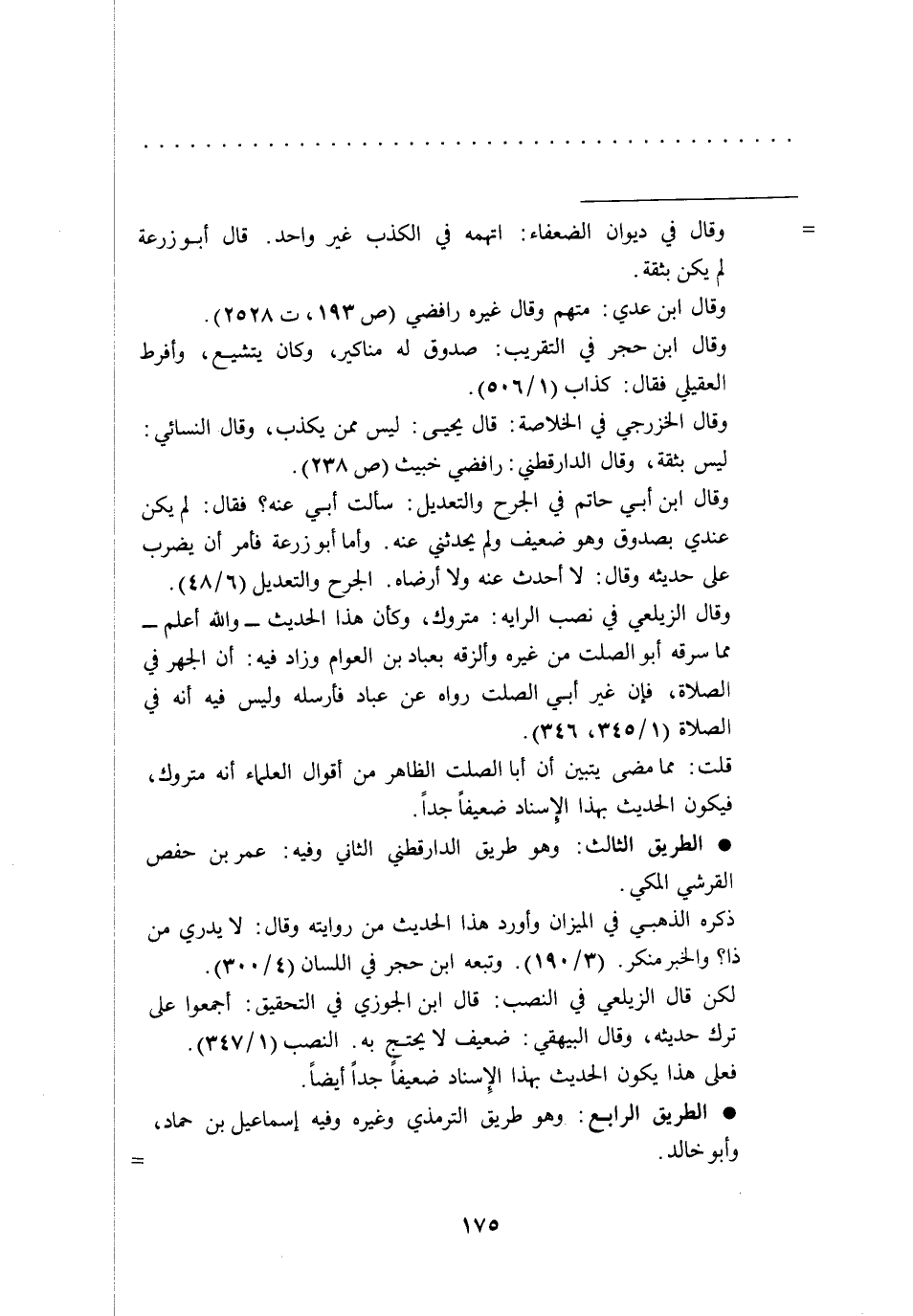وقال الزيلعي في نصب الرايه: متروك، وكأن هذا الحديث -والله أعلم- مما سرقه أبو الصلت من غيره وألزقه بعباد بن العوام وزاد فيه: أن الجهر في الصلاة، فإن غير أبي الصلت رواه عن عباد فأرسله وليس فيه أنه في الصلاة (1/ 345، 346).