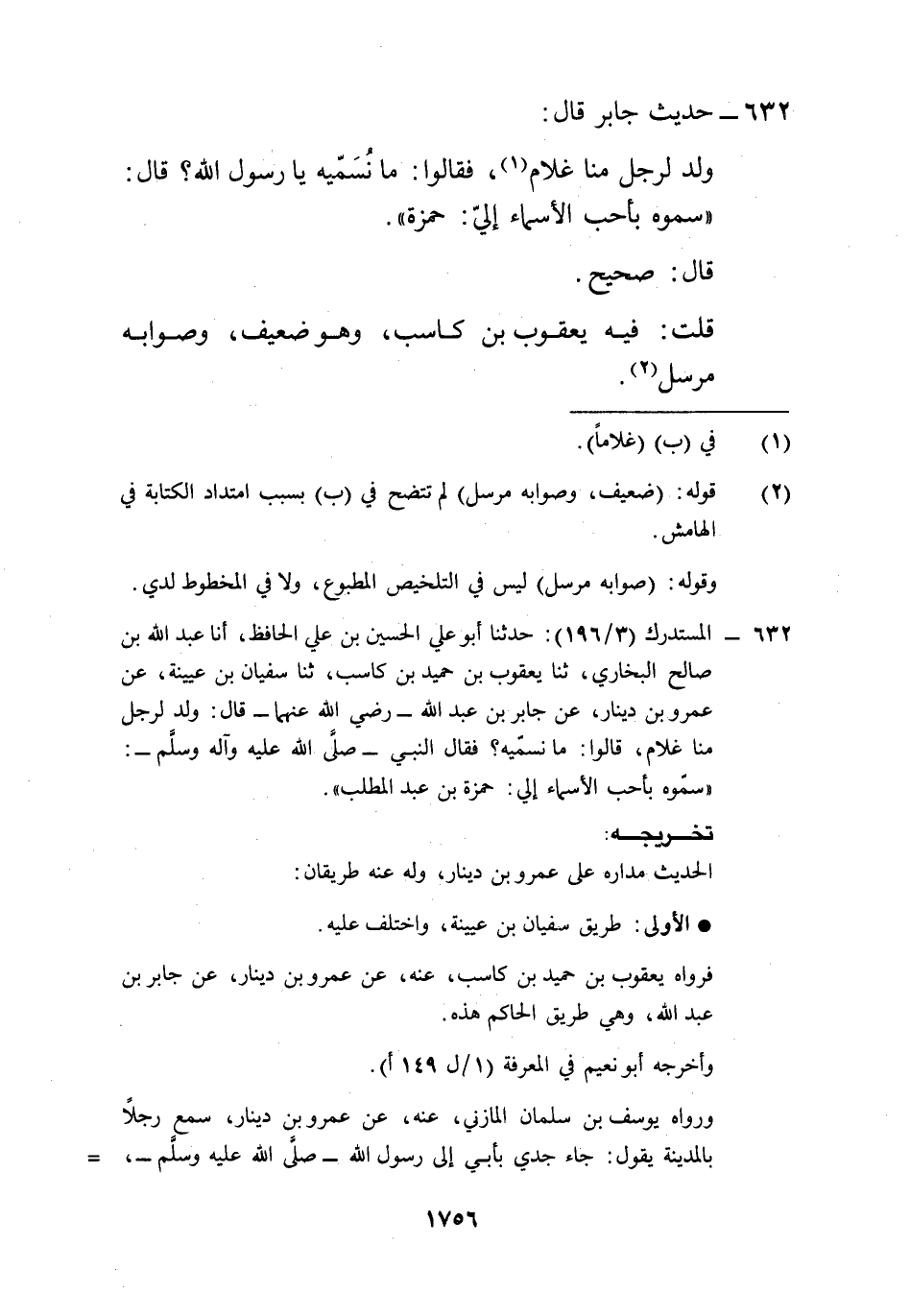 632 - المستدرك (3/ 196): حدثنا أبو علي الحسين بن علي الحافظ، أنا عبد الله بن صالح البخاري، ثنا يعقوب بن حميد بن كاسب، ثنا سفيان بن عيينة، عن عمرو بن دينار، عن جابر بن عبد الله -رضي الله عنهما- قال: ولد لرجل منا غلام، قالوا: ما نسميه؟ فقال النبي -صلى الله عليه وآله وسلم-: "سمّوه بأحب الأسماء إلي: حمزة بن عبد المطلب".