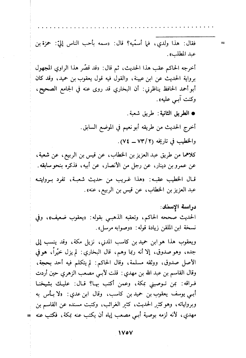 ويعقوب هذا هو ابن حميد بن كاسب المدني، نزيل مكة، وقد ينسب إلى جده، وهو صدوق، إلا أنه ربما وهم، قال البخاري: لم يزل خيراً، هو في الأصل صدوق، ووثقه مسلمة، وقال الحاكم: لم يتكلم فيه أحد بحجة، وقال القاسم بن عبد الله بن مهدي: قلت لأبي مصعب الزهري حين أردت فراقه: بمن توصيني بمكة، وعمن أكتب بها؟ قال: عليك بشيخنا أبي يوسف يعقوب بن حميد بن كاسب، وقال ابن عدي: "لا بأس به وبرواياته، وهو كثير الحديث، كثير الغرائب، وكتبت مسنده عن القاسم بن مهدي، لأنه لزمه بوصية أبي مصعب إياه أن يكتب عنه بمكة، فكتب عنه =