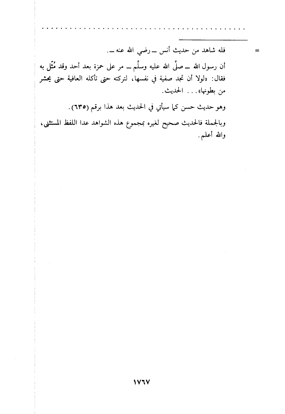 أن رسول الله -صلى الله عليه وسلم- مر على حمزة بعد أحد وقد مُثّل به فقال: "لولا أن تجد صفية في نفسها، لتركته حتى تأكله العافية حتى يحشر من بطونها" ... الحديث.