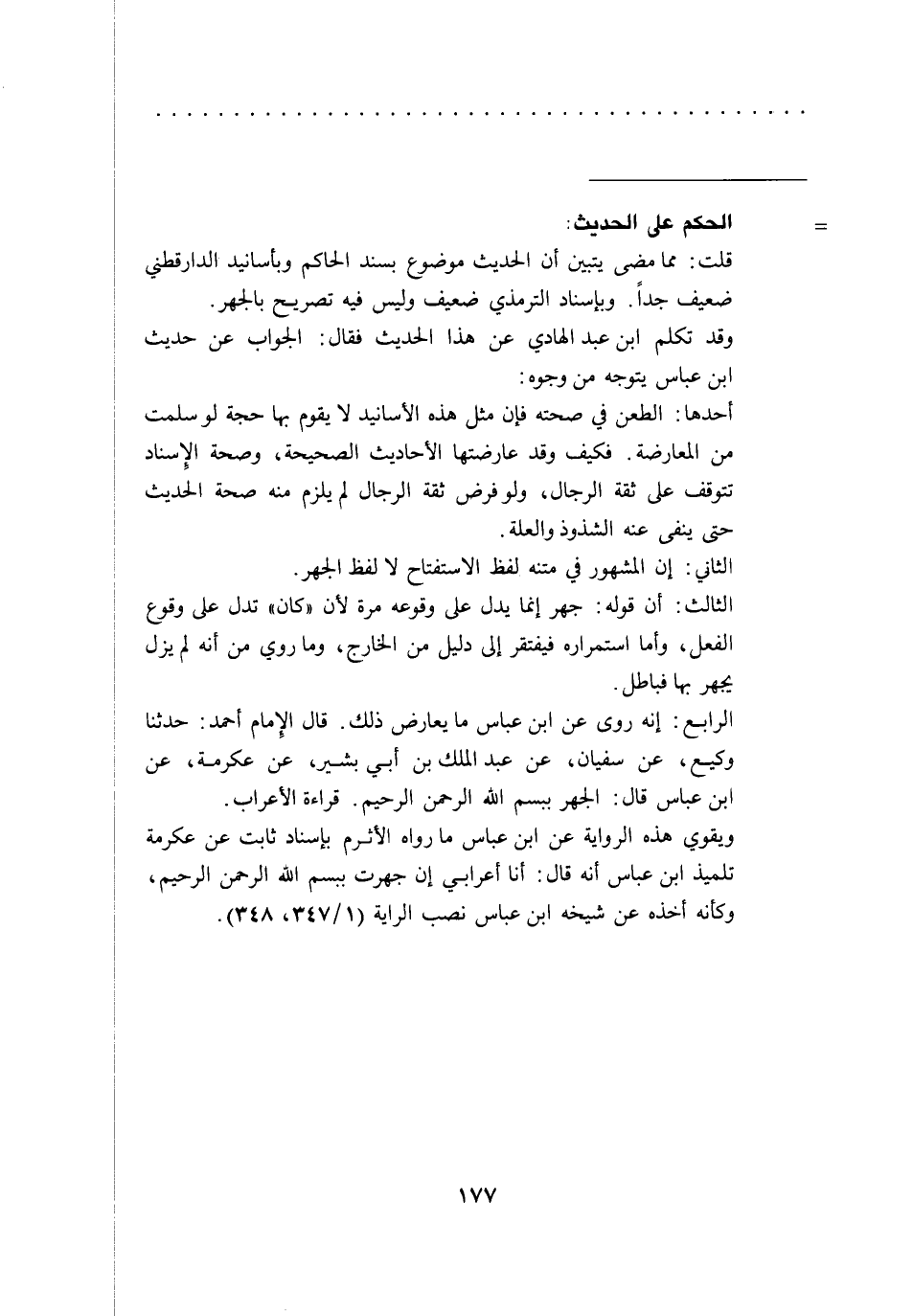 الرابع: إنه روى عن ابن عباس ما يعارض ذلك. قال الِإمام أحمد: حدثنا وكيع، عن سفيان، عن عبد الملك بن أبي بشير، عن عكرمة، عن ابن عباس قال: الجهر ببسم الله الرحمن الرحيم. قراءة الأعراب.