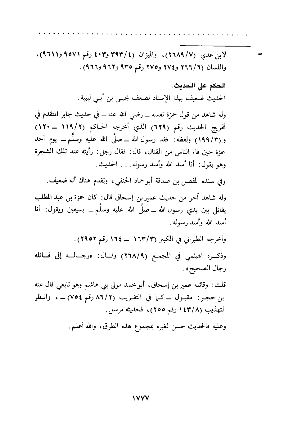 وله شاهد آخر من حديث عمير بن إسحاق قال: كان حمزة بن عبد المطلب يقاتل بين يدي رسول الله -صلى الله عليه وسلم- بسيفين ويقول: أنا أسد الله وأسد رسوله.