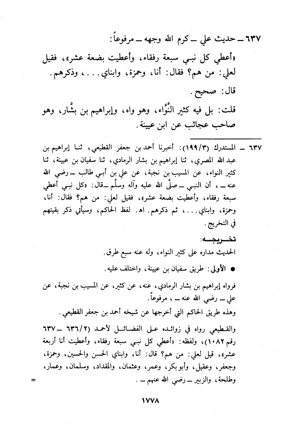 637 - المستدرك (3/ 199): أخبرنا أحمد بن جعفر القطيعي، ثنا إبراهيم بن عبد الله المصري، ثنا إبراهيم بن بشار الرمادي، ثنا سفيان بن عيينة، ثنا كثير النواء، عن المسيب بن نجبة، عن علي بن أبي طالب -رضي الله عنه-، أن النبي -صلى الله عليه وآله وسلم- قال: "كل نبي أعطي سبعة رفقاء، وأعطيت بضعة عشر"، فقيل لعلي: من هم؟ فقال: أنا، وحمزة، وابناي ... ، ثم ذكرهم. اهـ. لفظ الحاكم، وسيأتي ذكر بقيتهم في التخريج.