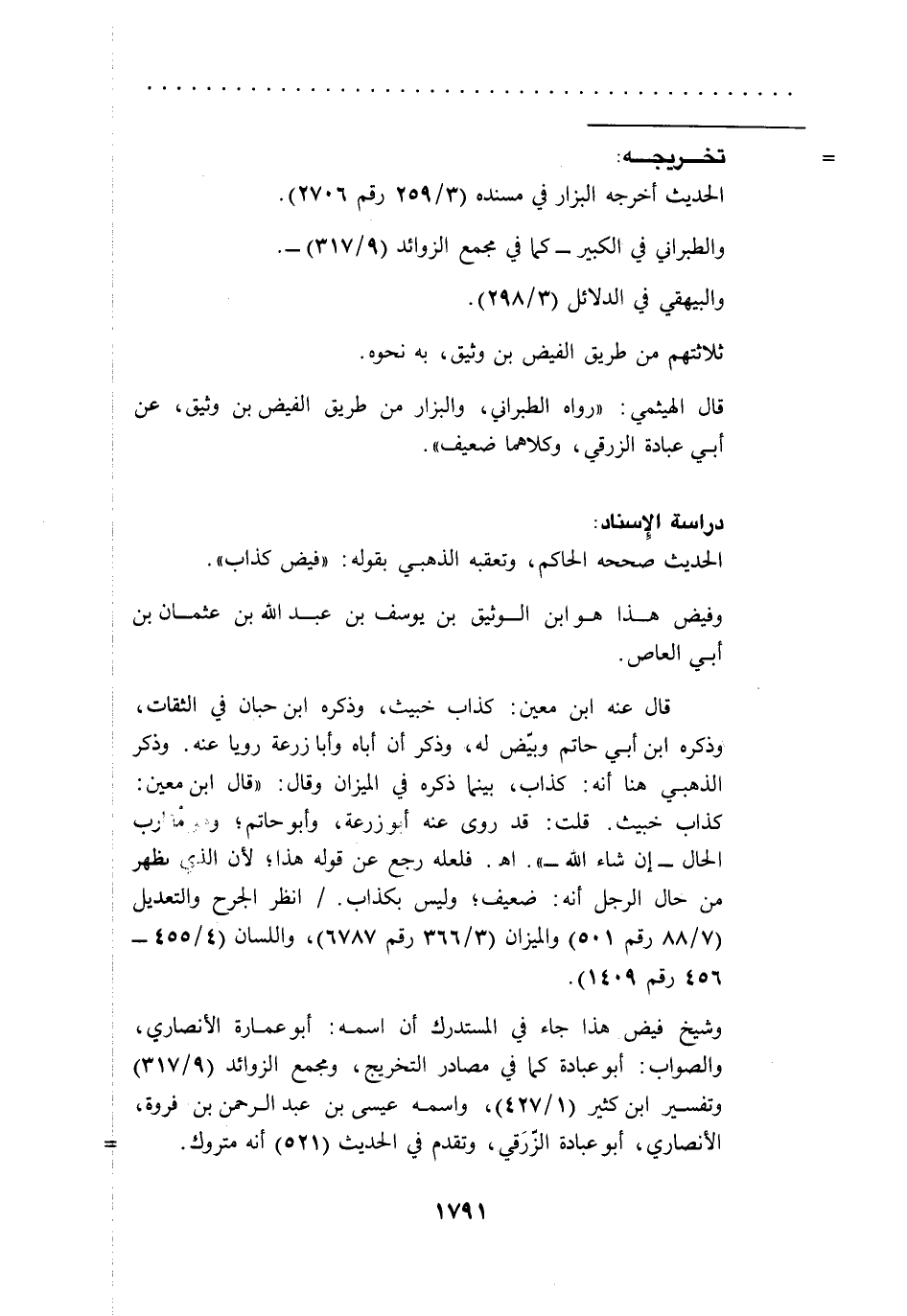 قال الهيثمي: "رواه الطبراني، والبزار من طريق الفيض وثيق، عن أبي عبادة الزرقي، وكلاهما ضعيف".