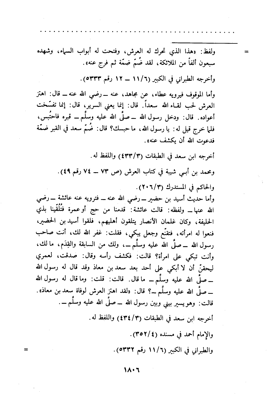 = ولفظ: "هذا الذي تحرك له العرش، وفتحت له أبواب السماء، وشهده سبعون ألفاً من الملائكة، لقد ضُمّ ضمّة ثم فرج عنه".