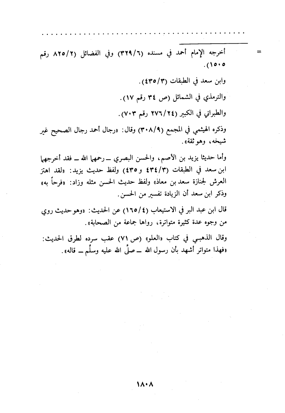 وأما حديثا يزيد بن الأصم، والحسن البصري -رحمهما الله- فقد أخرجهما ابن سعد في الطبقات (3/ 434و 435) ولفظ حديث يزيد: "لقد اهتز العرش لجنازة سعد بن معاذ في ولفظ حديث الحسن مثله وزاد: "فرحاً به" وذكر ابن سعد أن الزيادة تفسير من الحسن.