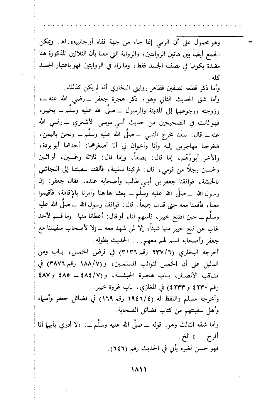 وأما شق الحديث الثاني وهو؛ ذكر هجرة جعفر -رضي الله عنه -، وزوجته ورجوعهما إلى المدينة والرسول -صلى الله عليه وسلم- بخيبر، فهو ثابت في الصحيحين من حديث أبي موسى الأشعري -رضي الله عنه- قال: بلغَنا مخرج النبي -صلى الله عليه وسلم- ونحن باليمن، فخرجنا مهاجرين إليه وأنا وأخوان لي أنا أصغرهما: أحدهما أبو بردة، والآخر أبو رُهْم، إما قال: بضعاً، وإما قال: ثلاثة وخمسين، أو اثنين وخمسين رجلاً من قومي، قال: فركبنا سفينة، فألقتنا سفينتنا إلى النجاشي بالحبشة، فوافقنا جعفر بن أبي طالب وأصحابه عنده، فقال جعفر: إن رسول الله -صلى الله عليه وسلم- بعثنا ها هنا وأمرنا بالإقامة؛ فأقيموا معنا، فأقمنا معه حتى قدمنا جميعاً. قال: فوافقنا رسول الله -صلى الله عليه وسلم- حين افتتح خيبر، فأسهم لنا، أو قال: أعطانا منها. وما قسم لأحد غاب عن فتح خيبر منها شيئاً؛ إلا لمن شهد معه- إلا لأصحاب سفينتنا مع جعفر وأصحابه قسم لهم معهم ... الحديث بطوله.