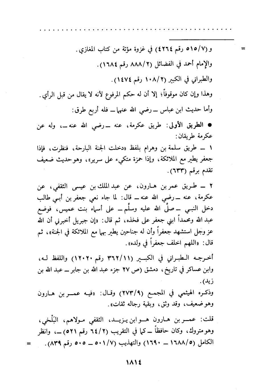 2 - طريق عمر بن هارون، عن عبد الملك بن عيسى الثقفي، عن عكرمة، عنه -رضي الله عنه- قال: لما جاء نعي جعفر بن أبي طالب دخل النبي -صلى الله عليه وسلم- على أسماء بنت عميس، فوضع عبد الله ومحمداً ابني جعفر على فخذه، ثم قال: "إن جبريل أخبرني أن الله عز وجل استشهد جعفراً وأن له جناحين يطير بهما مع الملائكة في الجنة"، ثم قال: "اللهم اخلف جعفراً في ولده".