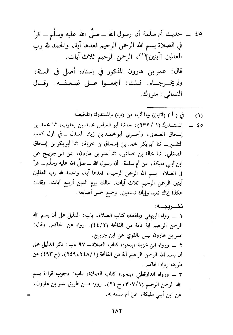 45 - المستدرك (1/ 232): حدثنا أبو العباس محمد بن يعقوب، ثنا محمد بن إسحاق الصغاني، وأخبرني أبو محمد بن زياد العدل -في أول كتاب التفسير- ثنا أبو بكر محمد بن إسحاق بن خزيمة، ثنا أبو بكر بن إسحاق الصغاني، ثنا خالد بن خداش، ثنا عمر بن هارون، عن ابن جريج عن ابن أبي مليكة، عن أم سلمة: أن رسول الله -صلى الله عليه وسلم- قرأ في الصلاة: بسم الله الرحمن الرحيم، فعدها آية، والحمد لله رب العالمين آيتين الرحمن الرحيم ثلاث آيات. مالك يوم الدين أربع آيات. وقال: هكذا إياك نعبد وإياك نستعين. وجمع خمس أصابعه.