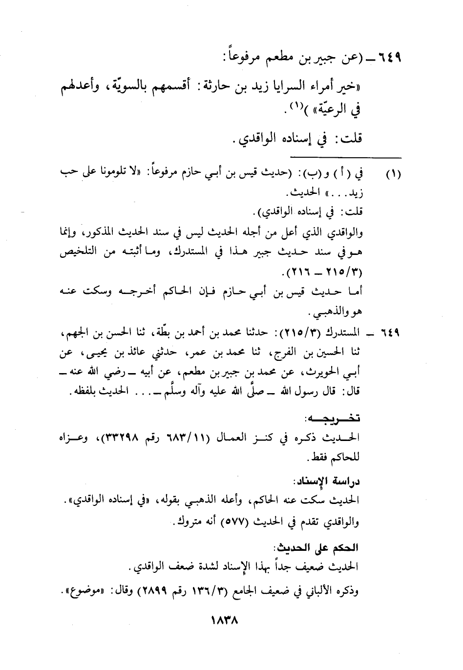 649 - المستدرك (3/ 215): حدثنا محمد بن أحمد بن بطّة، ثنا الحسن بن الجهم، ثنا الحسن بن الفرج، ثنا محمد بن عمر، حدثني عائذ بن يحيى، عن أبي الحويرث، عن محمد بن جبير بن مطعم، عن أبيه -رضي الله عنه- قال: قال رسول الله -صلى الله عليه وآله وسلم- ... الحديث بلفظه.