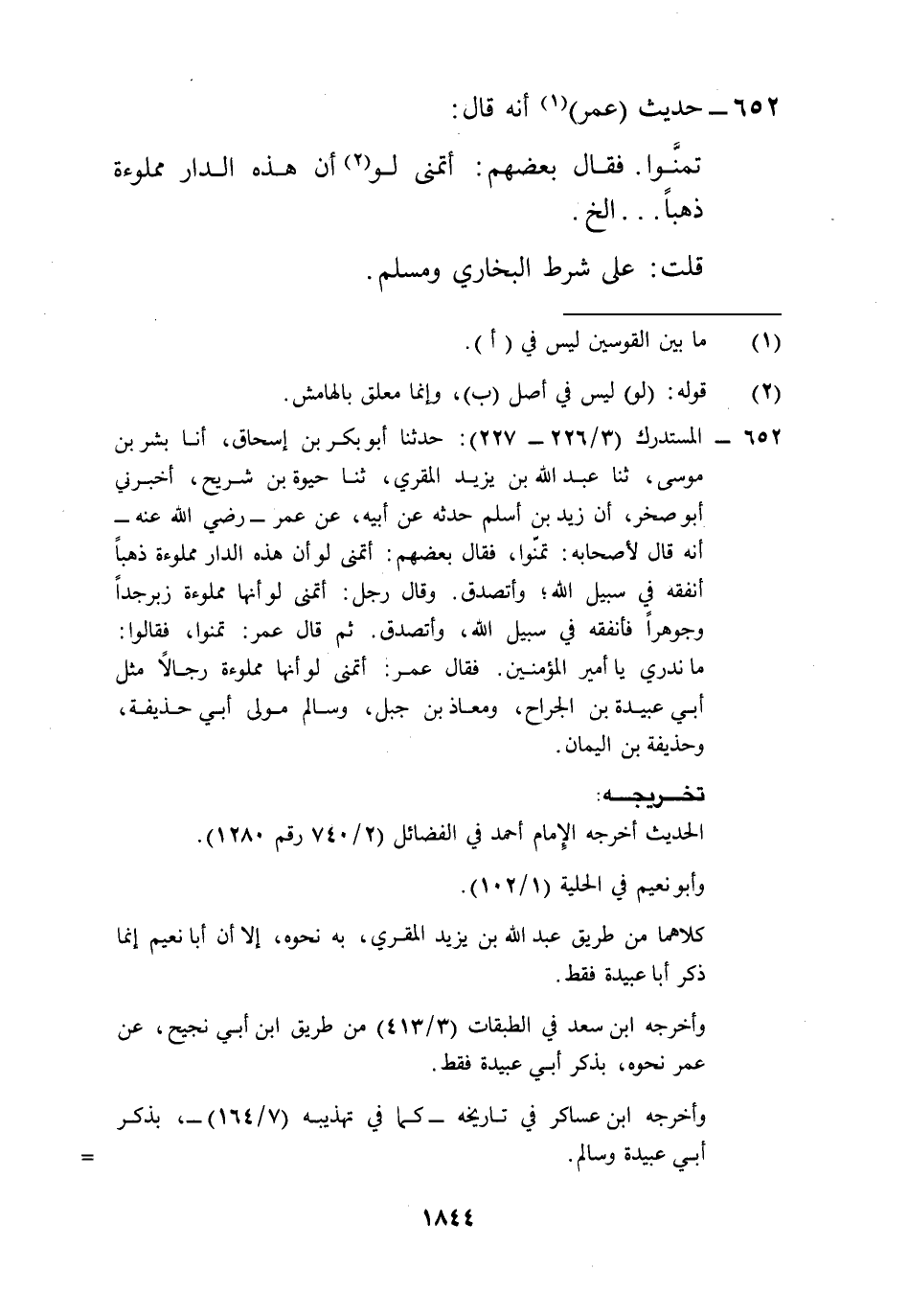 652 - المستدرك (3/ 226 - 227): حدثنا أبو بكر بن إسحاق، أنا بشر بن موسى، ثنا عبد الله بن يزيد المقري، ثنا حيوة بن شريح، أخبرني أبو صخر، أن زيد بن أسلم حدثه عن أبيه، عن عمر -رضي الله عنه- أنه قال لأصحابه: تمنّوا، فقال بعضهم: أتمنى لو أن هذه الدار مملوءة ذهباً أنفقه في سبيل الله؛ وأتصدق. وقال رجل: أتمنى لو أنها مملوءة زبرجداً وجوهراً فأنفقه في سبيل الله، وأتصدق. ثم قال عمر: تمنوا، فقالوا: ما ندري يا أمير المؤمنين. فقال عمر: أتمنى لو أنها مملوءة رجالاً مثل أبي عبيدة بن الجراح، ومعاذ بن جبل، وسالم مولى أبي حذيفة، وحذيفة بن اليمان.