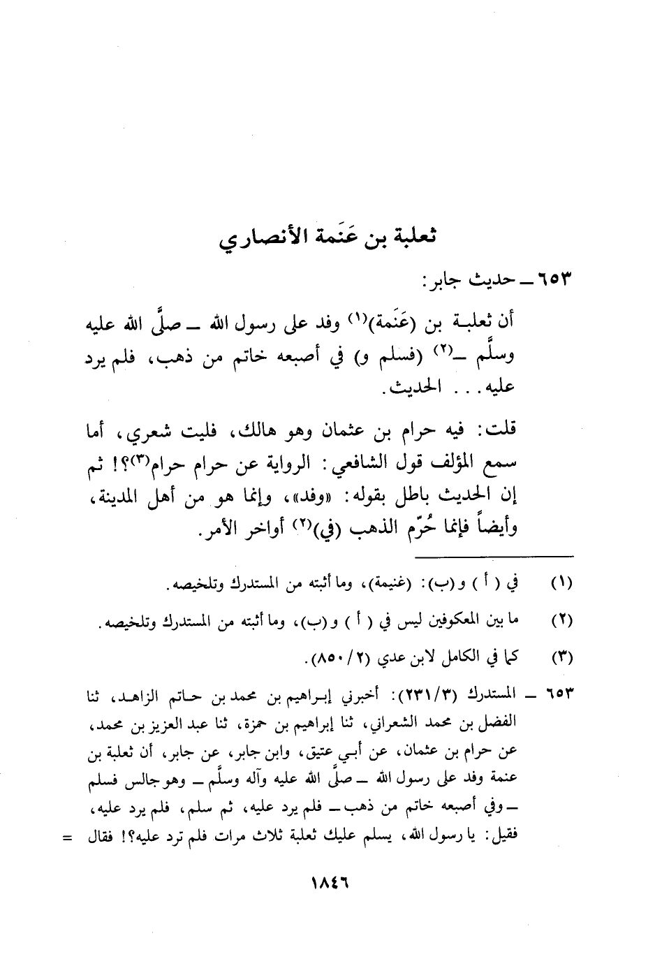 653 - المستدرك (3/ 231): أخبرني إبراهيم بن محمد بن حاتم الزاهد، ثنا الفضل بن محمد الشعراني، ثنا إبراهيم بن حمزة، ثنا عبد العزيز بن محمد، عن حرام بن عثمان، عن أبي عتيق، وابن جابر، عن جابر، أن ثعلبة بن عنمة وفد على رسول الله -صلى الله عليه وآله وسلم- وهو جالس فسلم -وفي أصبعه خاتم من ذهب- فلم يرد عليه، ثم سلم، فلم يرد عليه، فقيل: يا رسول الله، يسلم عليك ثعلبة ثلاث مرات فلم ترد عليه؟! فقال =