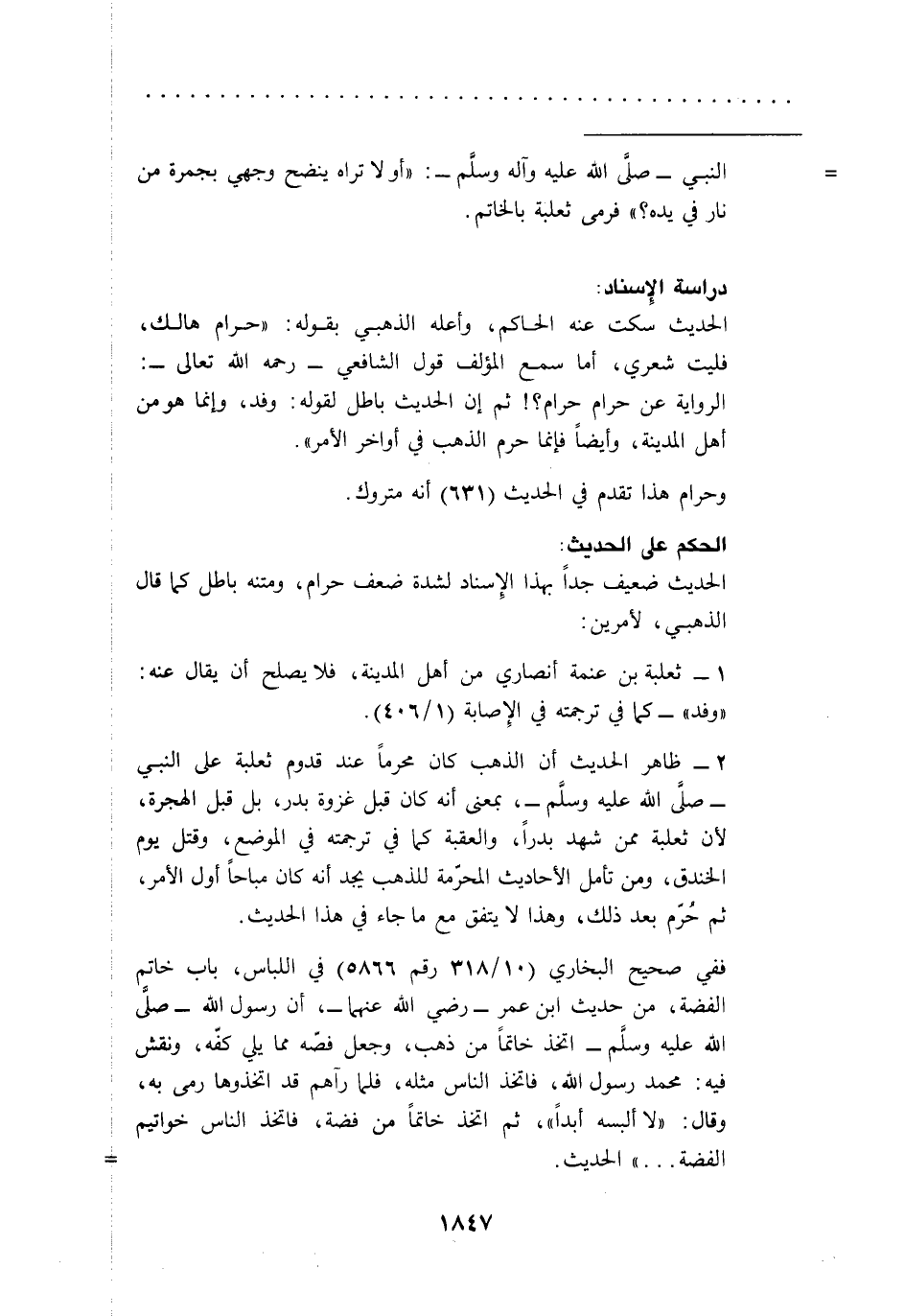 2 - ظاهر الحديث أن الذهب كان محرماً عند قدوم ثعلبة على النبي -صلى الله عليه وسلَّم-، بمعنى أنه كان قبل غزوة بدر، بل قبل الهجرة، لأن ثعلبة ممن شهد بدراً، والعقبة كما في ترجمته في الموضع، وقتل يوم الخندق، ومن تأمل الأحاديث المحرّمة للذهب يجد أنه كان مباحاً أول الأمر، ثم حُرّم بعد ذلك، وهذا لا يتفق مع ما جاء في هذا الحديث.