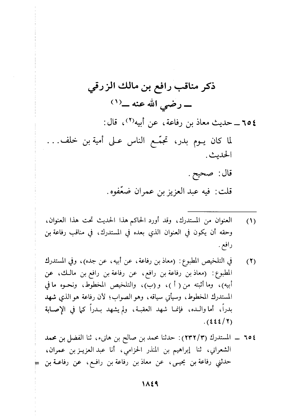 (¬1) العنوان من المستدرك، وقد أورد الحاكم هذا الحديث تحت هذا العنوان، وحقه أن يكون في العنوان الدي بعده في المستدرك، في مناقب رفاعة بن رافع.