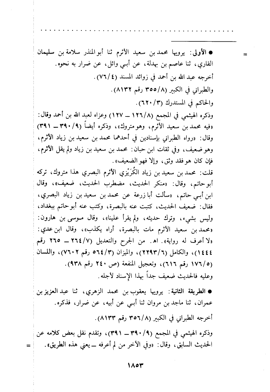 = * الأولى: يرويها محمد بن سعيد الأثرم ثنا أبو المنذر سلامة بن سليمان القاري، ثنا عاصم بن بهدلة، عن أبي وائل، عن ضرار به نحوه.
