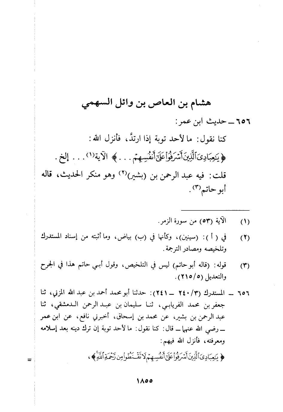 656 - المستدرك (3/ 240 - 241): حدثنا أبو محمد أحمد بن عبد الله المزني، ثنا جعفر بن محمد الفريابي، ثنا سليمان بن عبد الرحمن الدمشقي، ثنا عند الرحمن بن بشير، عن محمد بن إسحاق، أخبرني نافع، عن ابن عمر -رضي الله عنهما- قال: كنا نقول: ما لأحد توبة إن ترك دينه بعد إسلامه ومعرفته، فأنزل الله فيهم: