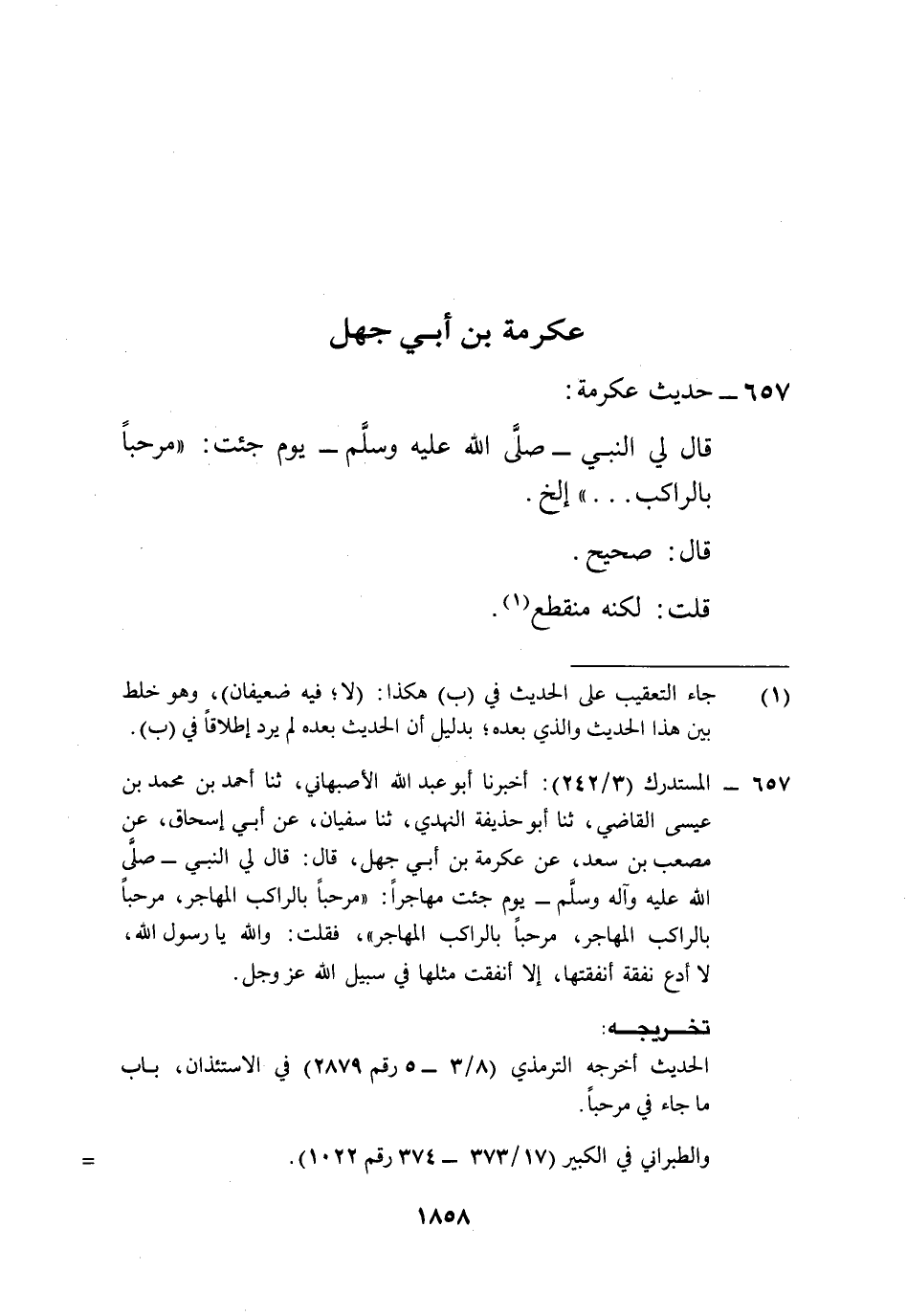 657 - المستدرك (3/ 242): أخبرنا أبو عبد الله الأصبهاني، ثنا أحمد بن محمد بن عيسى القاضي، ثنا أبو حذيفة النهدي، ثنا سفيان، عن أبي إسحاق، عن مصعب بن سعد، عن عكرمة بن أبي جهل، قال: قال لي النبي -صلى الله عليه وآله وسلم- يوم جئت مهاجراً: "مرحباً بالراكب المهاجر، مرحباً بالراكب المهاجر، مرحباً بالراكب المهاجر"، فقلت: والله يا رسول الله، لا أدع نفقة أنفقتها، إلا أنفقت مثلها في سبيل الله عز وجل.