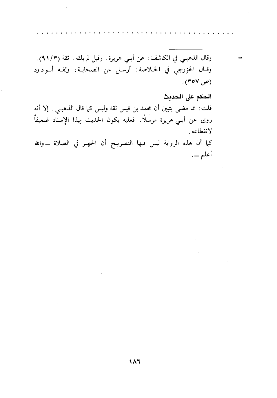 قلت: مما مضى يتبين أن محمد بن قيس ثقة وليس كما قال الذهبي. إلا أنه روى عن أبي هريرة مرسلاً. فعليه يكون الحديث بهذا الِإسناد ضعيفاً لانقطاعه.
