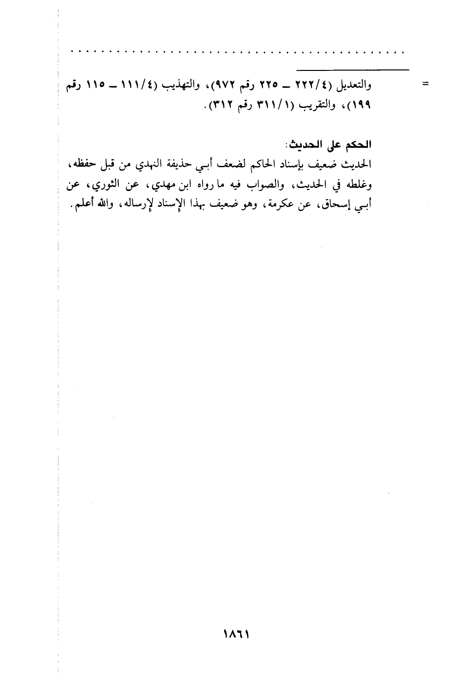 الحديث ضعيف بإسناد الحاكم لضعف أبي حذيفة النهدي من قبل حفظه، وغلطه في الحديث، والصواب فيه ما رواه ابن مهدي، عن الثوري، عن أبي إسحاق، عن عكرمة، وهو ضعيف بهذا الِإسناد لِإرساله، والله أعلم.