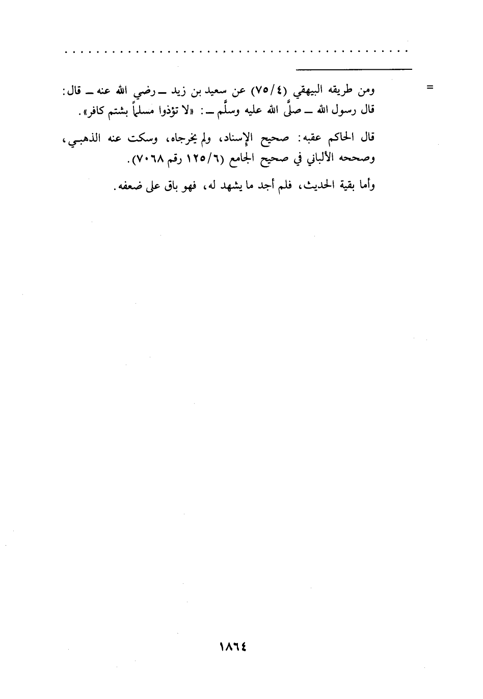 = ومن طريقه البيهقي (4/ 75) عن سعيد بن زيد -رضي الله عنه- قال: قال رسول الله -صلى الله عليه وسلم-: "لا تؤذوا مسلماً بشتم كافر".